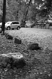 In a serene, black-and-white landscape, a line of rugged stones frames a peaceful parking lot, hinting at nature's quiet beauty amidst human presence. The scattered autumn leaves blanket the ground, creating a gentle contrast to the sleek lines of the parked car. Soft, dappled lighting filters through the trees, enhancing the tranquil mood of the scene.