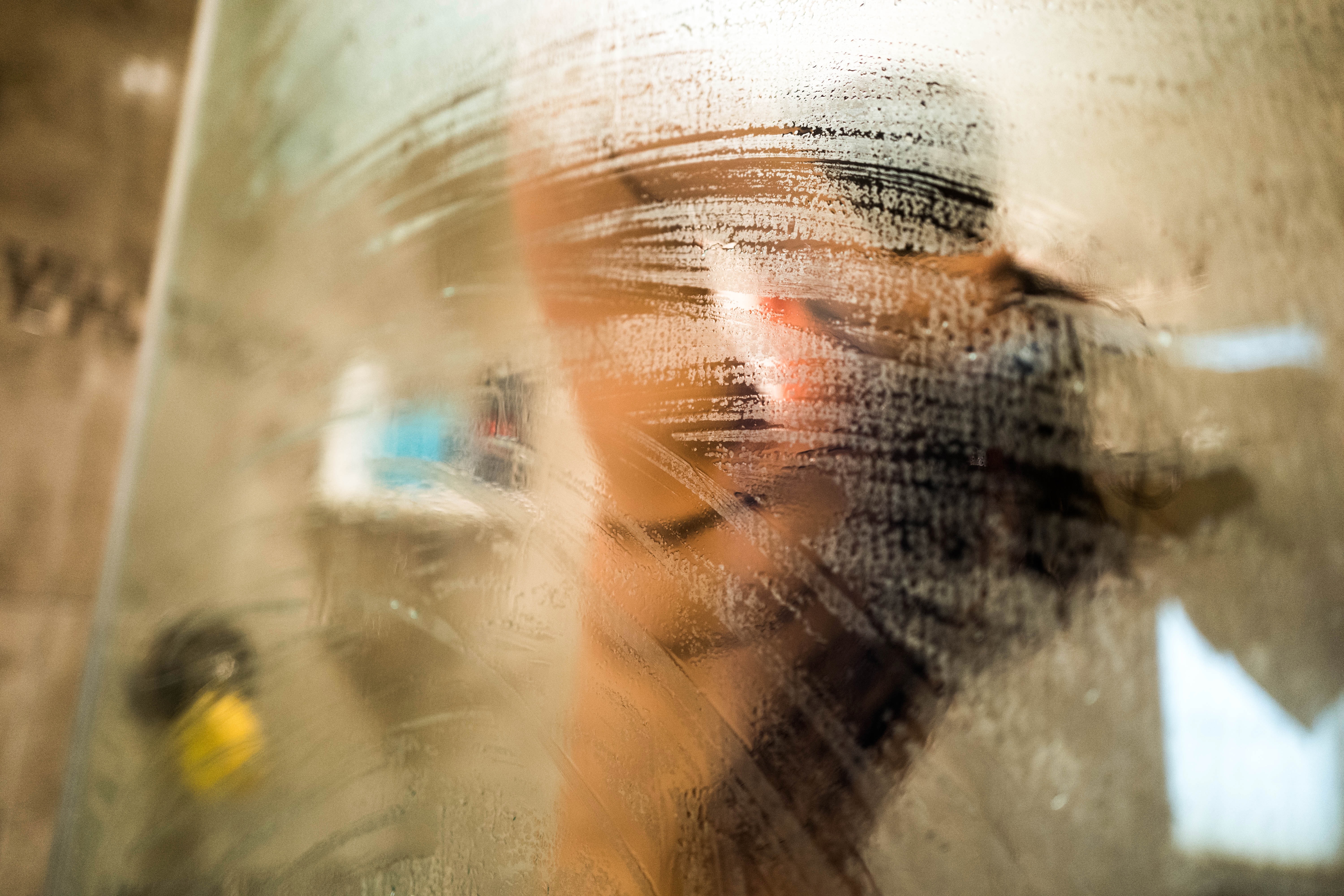 The photograph captures a blurred figure behind a foggy glass pane, evoking a sense of intimacy and privacy. The warm light contrasts with the cool tones of the steam, creating an atmosphere of serene solitude. The subject's hand gently smudges the condensation, hinting at a moment of reflection or contemplation.