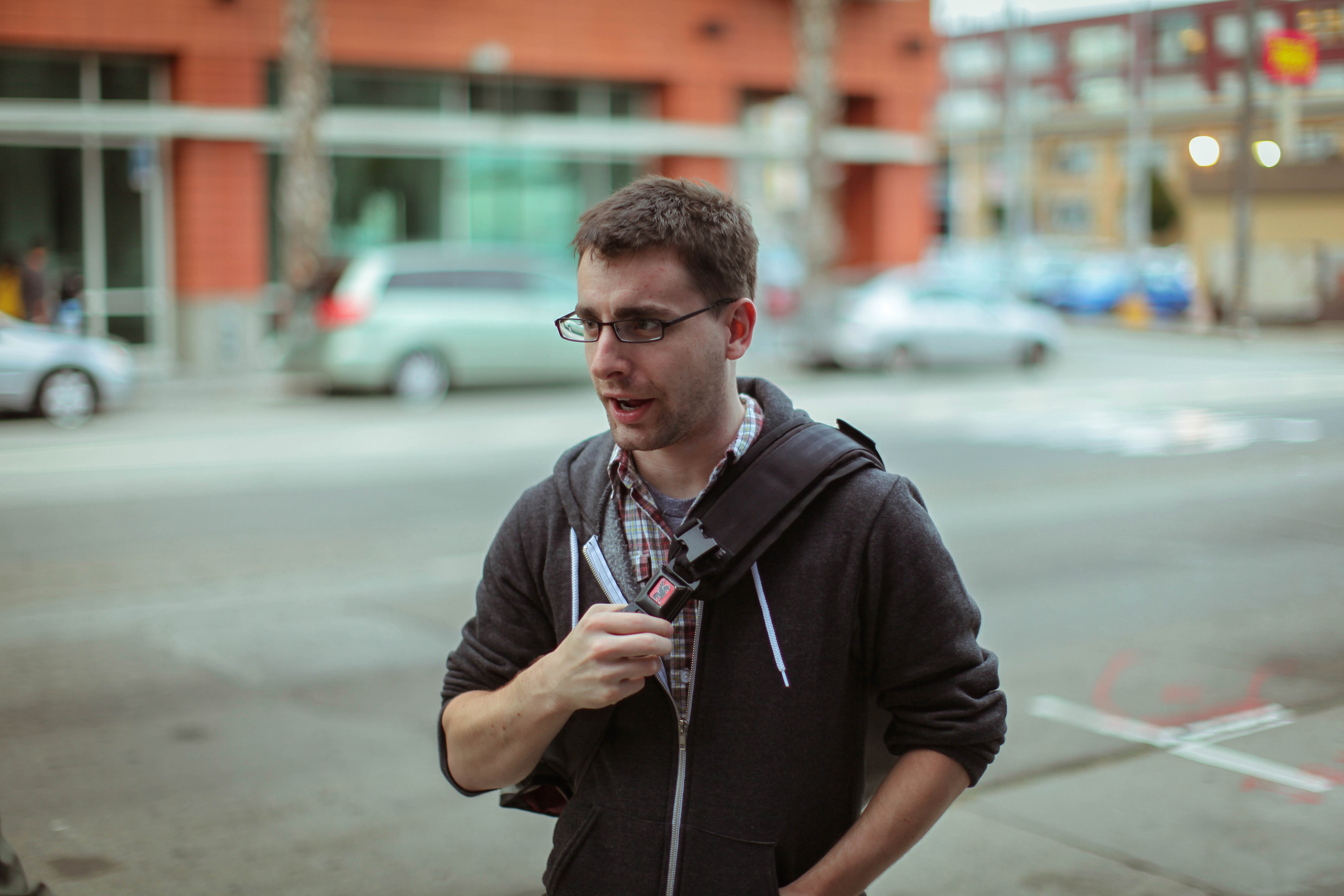 In a bustling city environment, a young man in a hoodie, holding a pen, appears deep in thought or engaged in conversation, creating a sense of candid vulnerability. The warm tones of the background contrast with his casual attire, while the slightly blurred cityscape hints at the dynamic atmosphere surrounding him. Soft, natural light bathes the scene, enhancing the intimate yet energetic mood of urban life.
