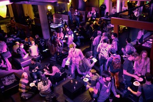 A buzzing lounge scene filled with a diverse crowd, where people engage in conversations and enjoy food amidst vibrant purple lighting. The composition captures various groups scattered throughout the space, illustrating a sense of community and festivity. The warm ambiance and lively interactions suggest an event full of networking and camaraderie, highlighting the joy of shared experiences.
