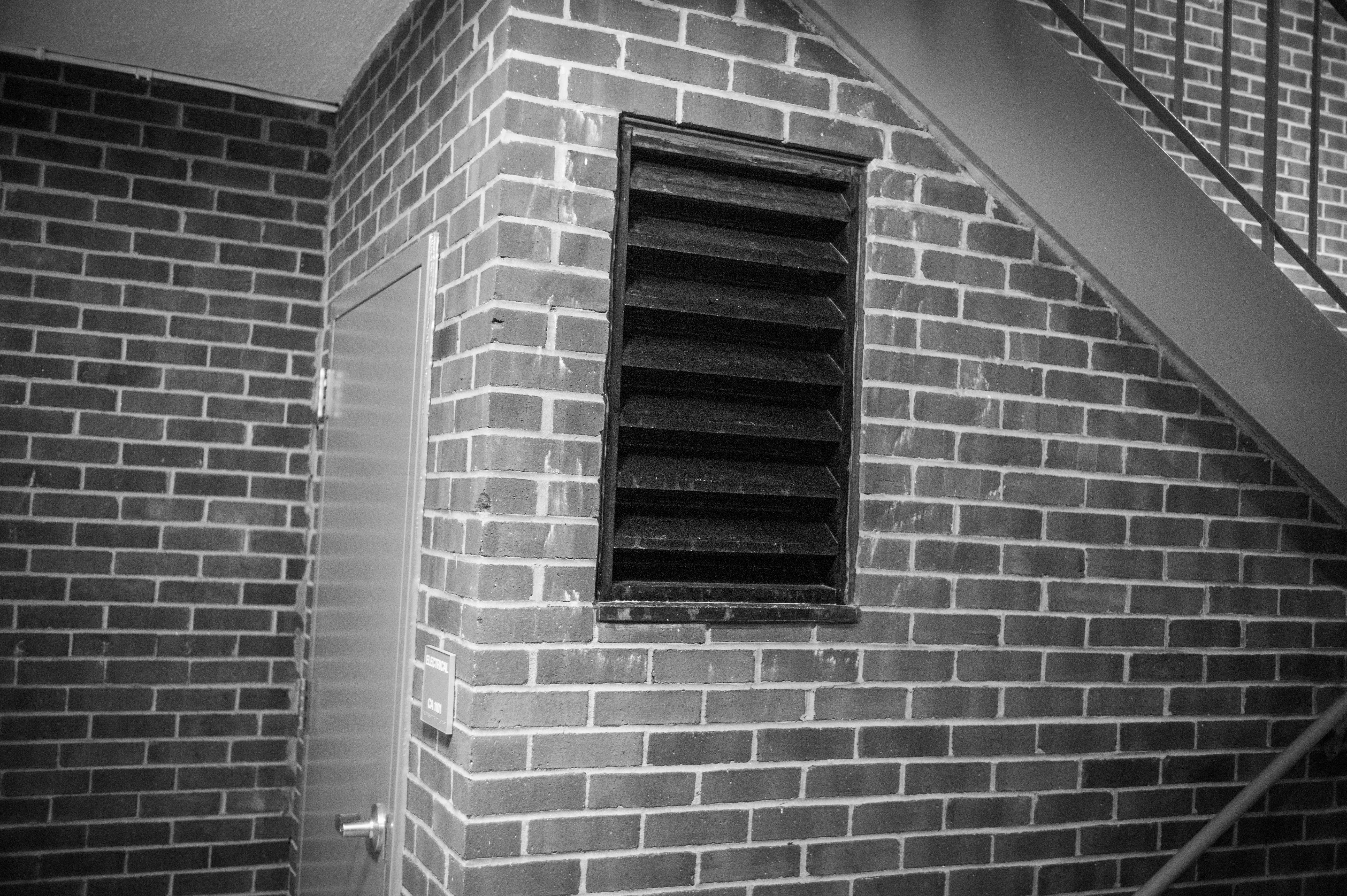 In a stark corner of an industrial stairwell, a black vent stands out against the rough brick wall. The monochrome tones evoke a sense of solitude and abstraction, creating a mood of quiet contemplation. Shadows cast by the overhead stairs contribute to the composition's tension, as lines and textures invite the viewer to explore the contrast between light and darkness.