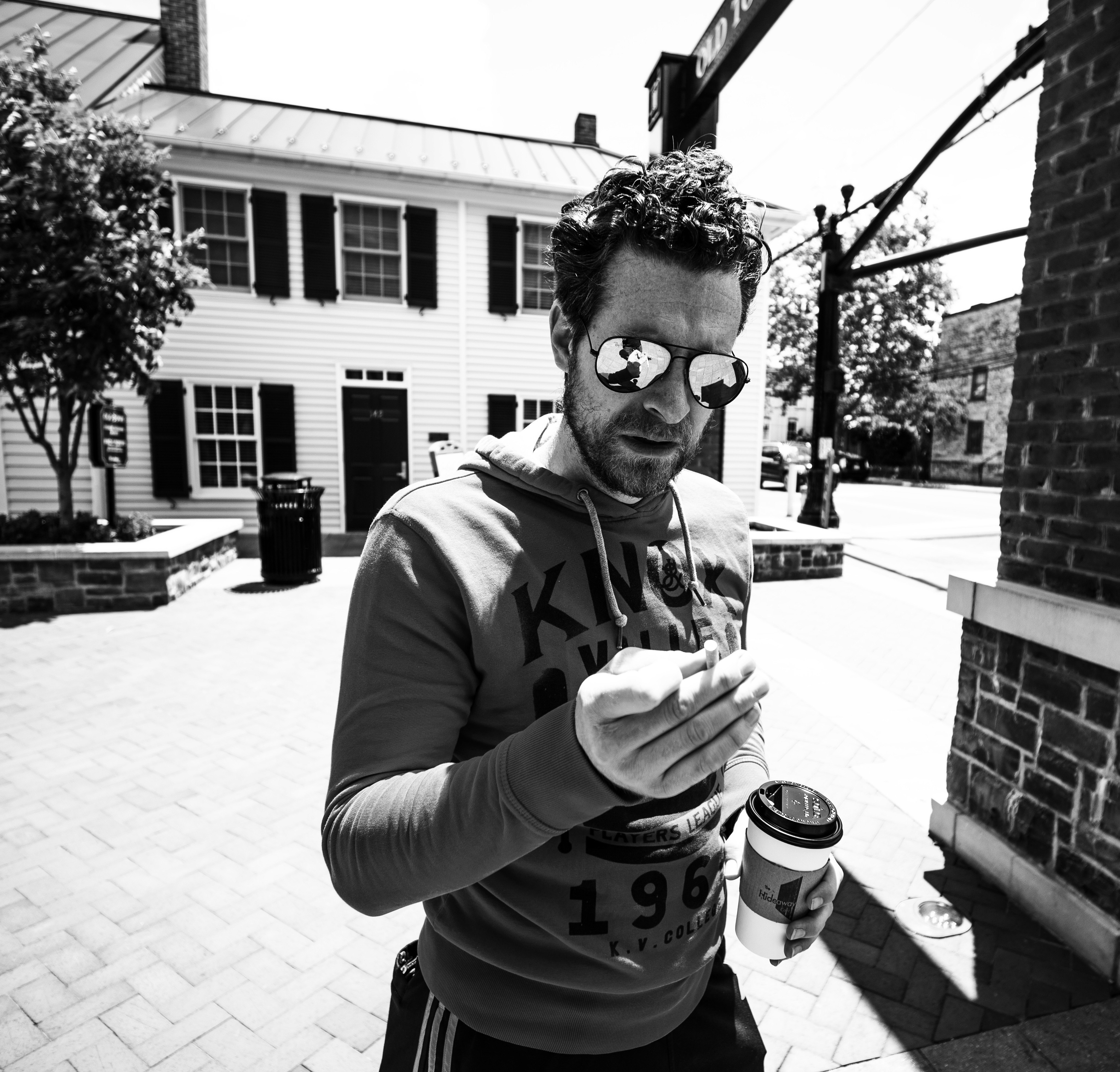 In a striking black and white composition, a man stands on a city street, absorbed in his thoughts as he examines something in his hand. The sunlight casts sharp shadows, emphasizing the textures of the brick and the man’s casual attire, while his reflective sunglasses add a layer of intrigue to his demeanor. The surrounding architecture hints at an urban setting, enhancing the contemplative mood of the moment.