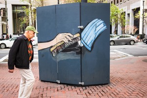 An elderly man walks past a vividly painted structure featuring a hand brushing a cap. The stark contrast between the mundane urban setting and the playful artwork creates a whimsical, contemplative mood. Soft natural light highlights the scene, emphasizing both the art and the lone figure in motion.