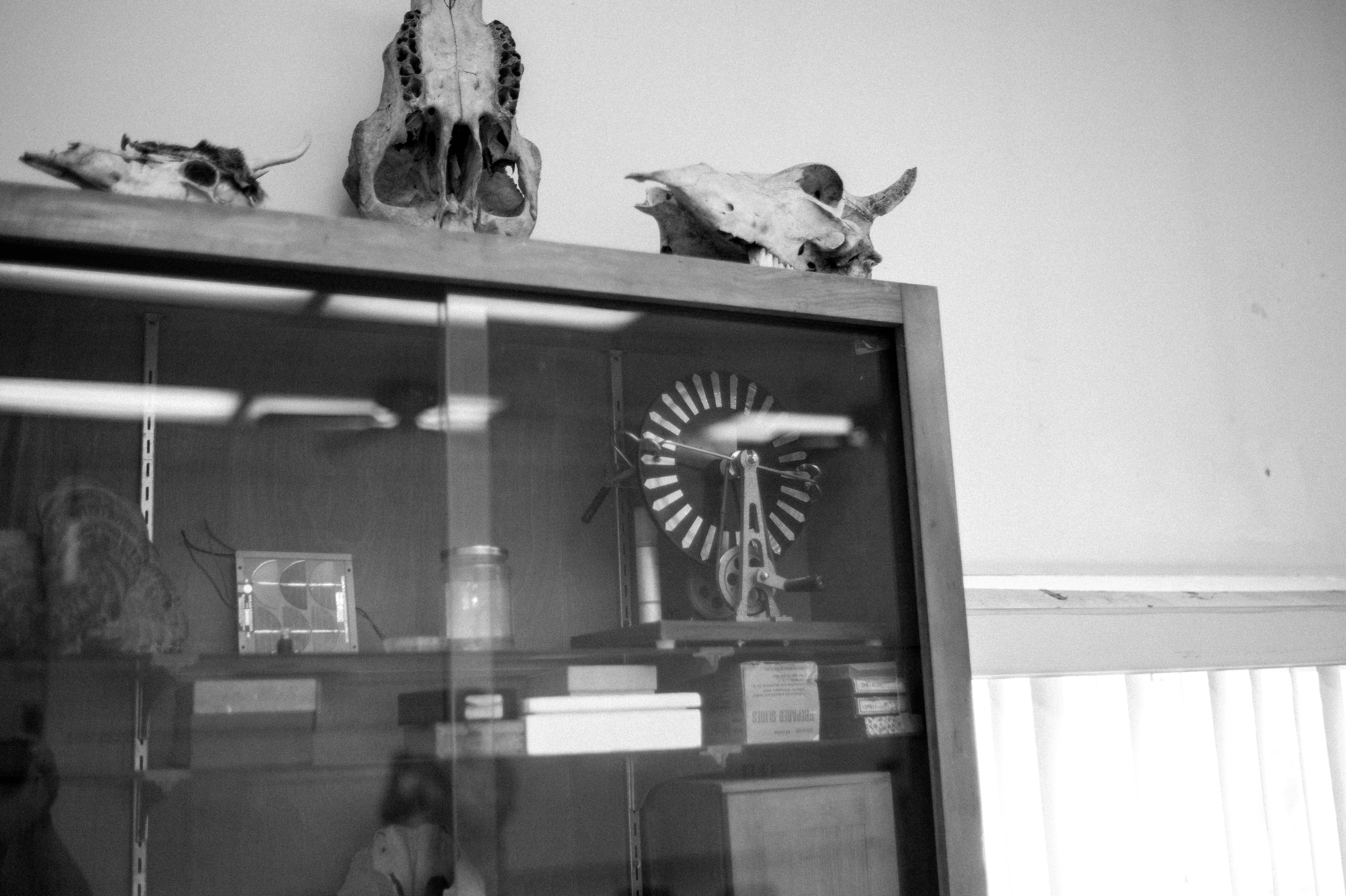 This black and white photograph captures a collection of animal skulls resting atop a wooden display case, which holds various artifacts and scientific instruments. The soft, diffused lighting creates a somber mood, enhancing the sense of curiosity and nostalgia within the space. The composition draws the eye upward through the contrasting textures of bone and polished wood, inviting contemplation of the relationship between nature and science.