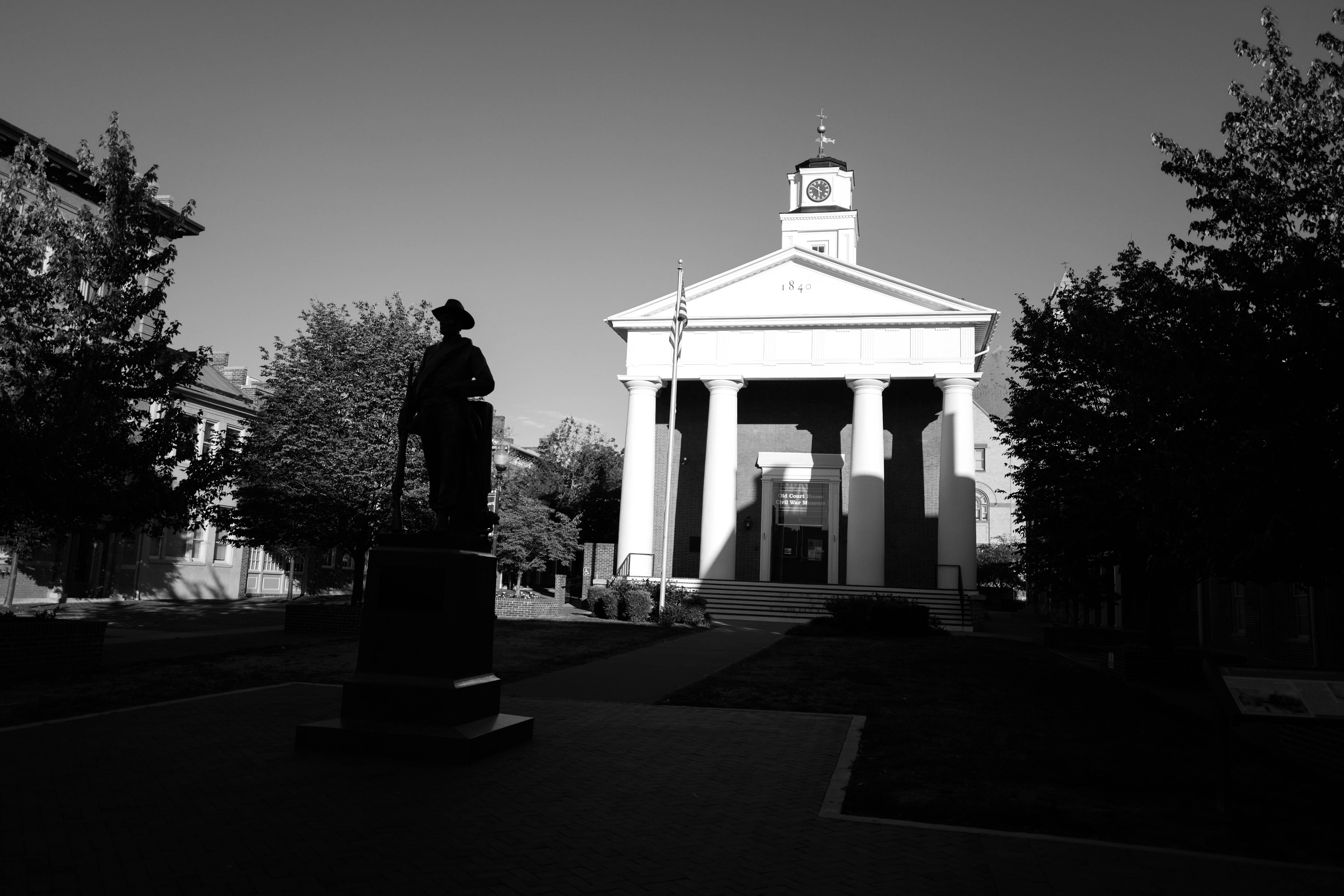 In this striking black-and-white photograph, a solitary statue stands in silhouette in front of a stately building, casting long shadows over the cobblestone path. The strong contrast between light and dark enhances the solemnity of the scene, while the clear sky and architectural lines evoke a sense of tranquility and permanence. The composition invites viewers to reflect on the history and stories that linger within this serene setting.