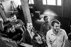 In a cozy, industrial space with warm lighting filtering through large windows, a group of men congregate in a relaxed and reflective moment. The monochrome tones amplify the intimacy of their expressions, highlighting a mix of curiosity and camaraderie among them. The composition draws the eye upward along the staircase, enhancing a sense of collaboration and engagement within their environment.