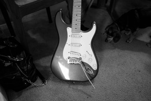 A vintage electric guitar rests on a soft, beige carpet, capturing a moment of quiet introspection. The scene is tinged with nostalgia as a small dog curiously investigates nearby, contrasting the bold metallic sheen of the guitar with the warm, muted tones of the room. The soft lighting creates an intimate atmosphere, inviting viewers to imagine the music that once filled the space.