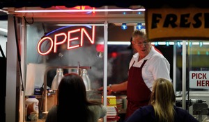 The photograph captures a lively scene at a food stall under vibrant neon lights, with the word 'OPEN' glowing prominently. A friendly vendor, clad in an apron, engages with eager customers, creating an inviting atmosphere filled with warmth and the promise of fresh offerings. The low, soft lighting contrasts with the bright neon, evoking a sense of nostalgia and late-night adventure.