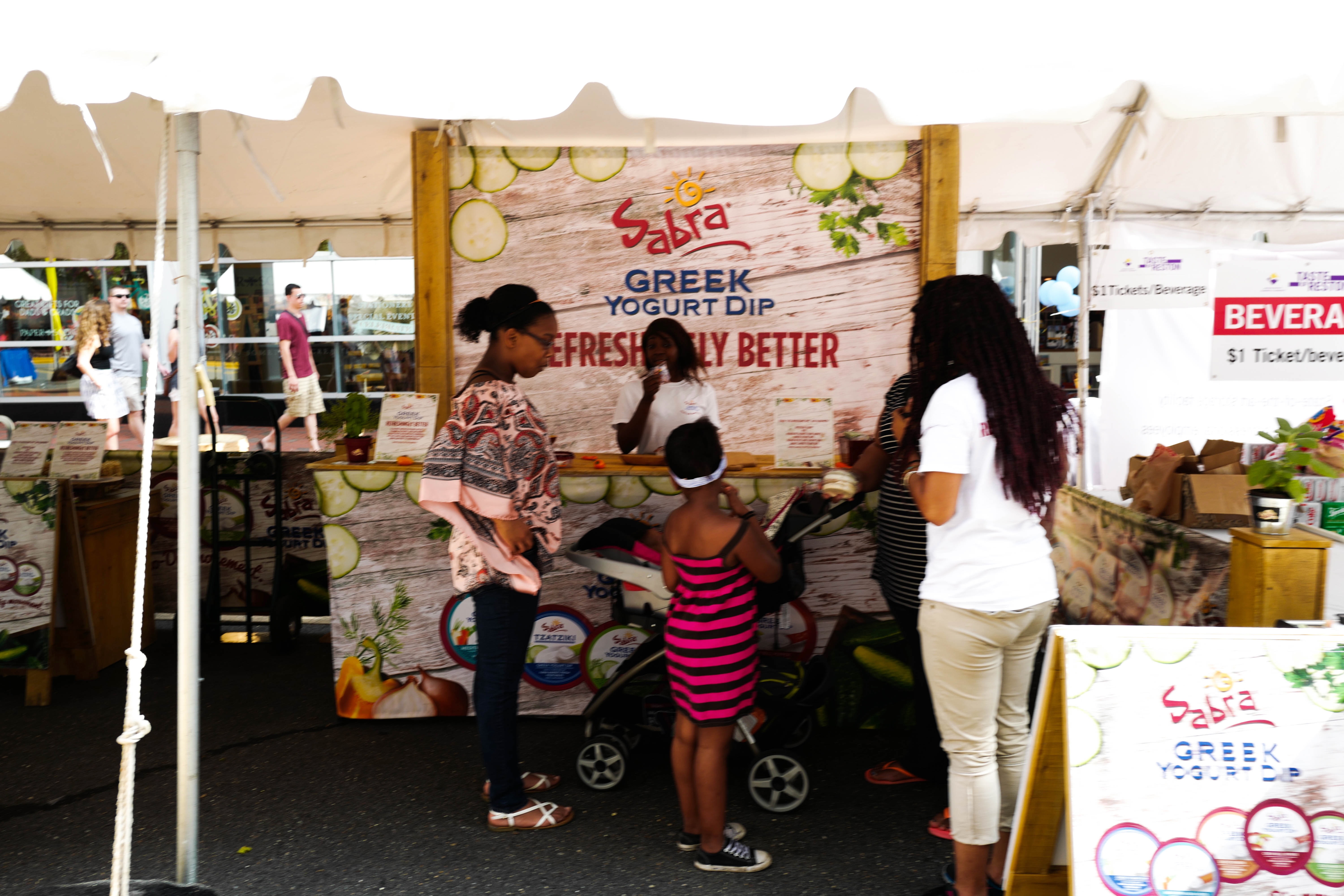 Under a bustling tent, visitors engage with a vibrant display of Sabra Greek yogurt dip, evoking a lively market atmosphere. The warm, diffused lighting enhances the inviting colors of the vibrant displays, while the diverse group suggests a shared moment of discovery and enjoyment. A sense of curiosity and community weaves through the scene, highlighting the joy of food and togetherness.