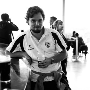 In a monochromatic palette, a man leans casually against the polished bar, exuding a relaxed confidence. His focused gaze contrasts with the blurred figures of patrons in the background, creating a sense of intimacy amidst the lively atmosphere. Soft, natural lighting illuminates the scene, enhancing the casual yet reflective mood of the moment.