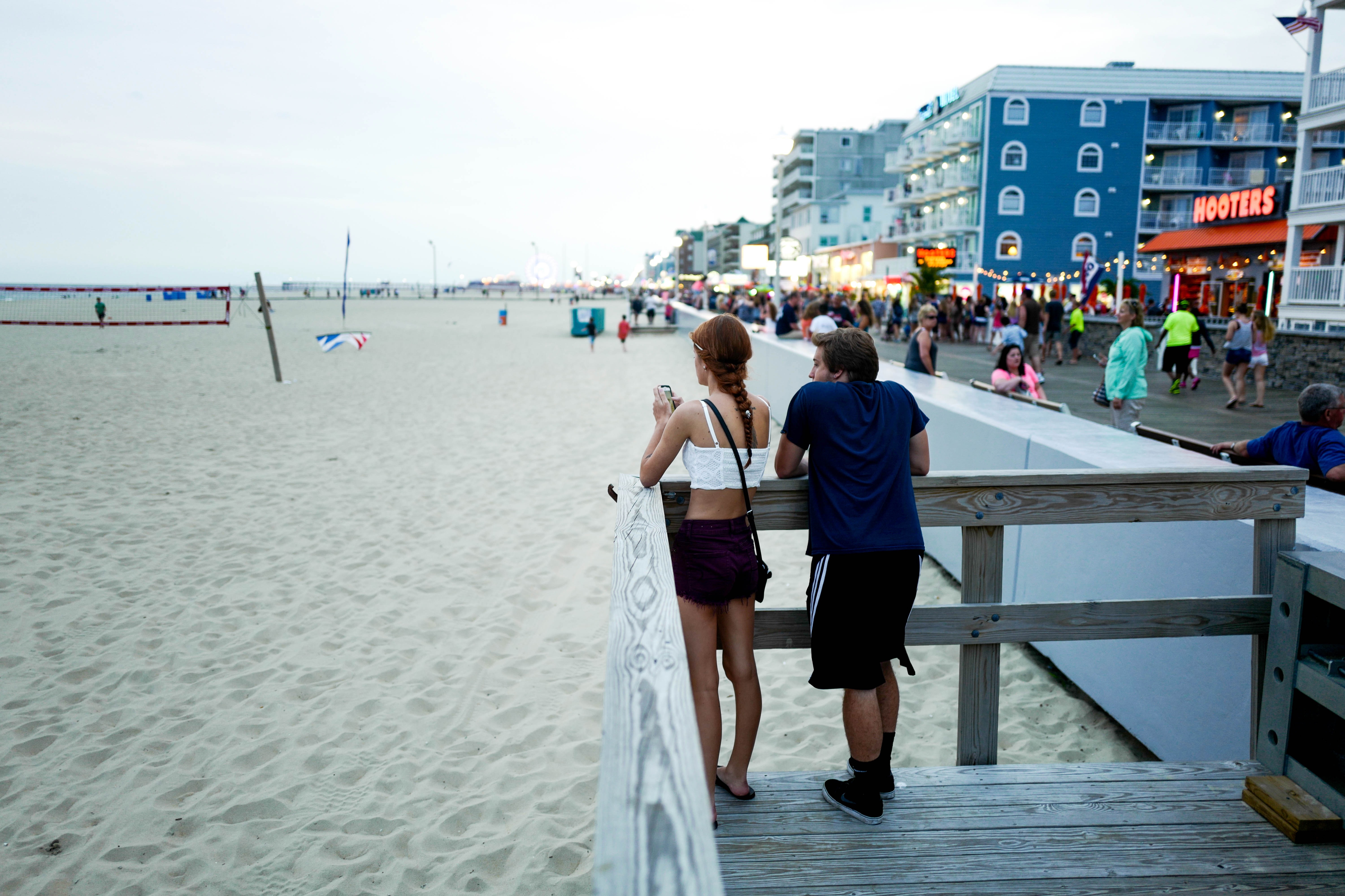 In this photograph, two young people stand on a wooden deck overlooking a quiet beach as the day transitions to evening. The soft, fading light casts a serene ambiance, enhancing the contrast between the peaceful sandy expanse and the bustling boardwalk in the background filled with colorful lights and activity. Their relaxed posture suggests a moment of connection as they enjoy the sights and sounds of a summer night by the ocean.