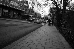 This black and white photograph captures a bustling urban street, where a couple walks closely, a child in a stroller, against a backdrop of busy traffic. The composition emphasizes the contrast between the sidewalk's texture and the smooth, rushing vehicles, with tall buildings looming overhead, creating a sense of depth. Soft lighting filters through the trees, adding a quiet, contemplative mood to the lively street scene.