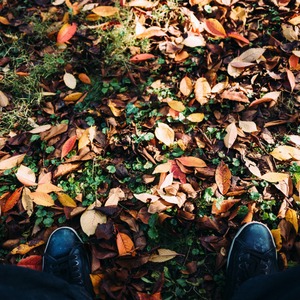 The photograph captures a close-up view of a carpet of autumn leaves, showcasing rich hues of orange, brown, and yellow. The dark sneakers placed at the edge of the frame suggest a moment of pause, inviting the viewer to reflect on the season's beauty. Dappled sunlight filters through the foliage, illuminating the leaves and creating a warm, nostalgic mood.