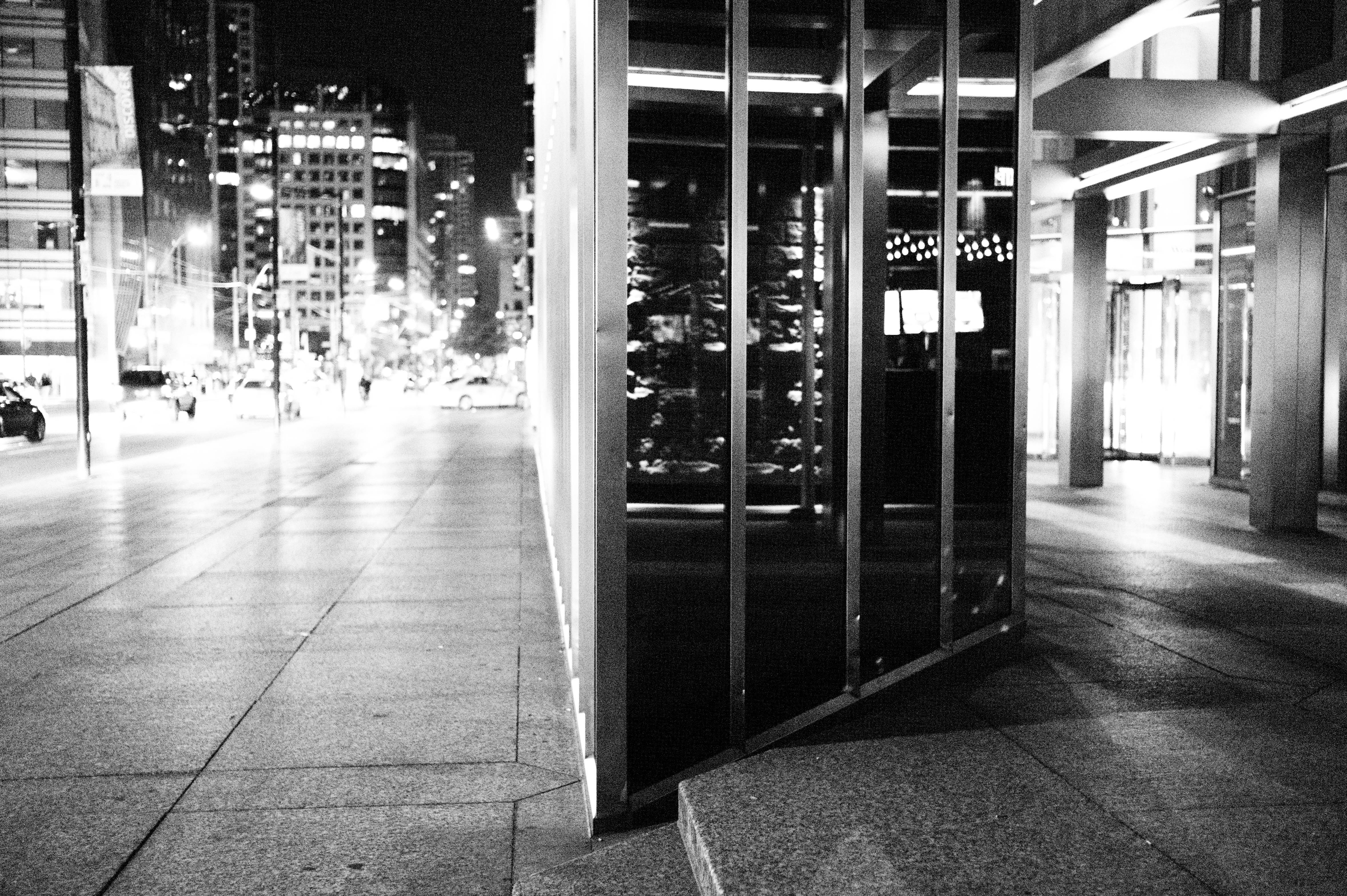 This striking black-and-white photograph captures a corner of a modern building set against a bustling city backdrop at night. The interplay of light and shadow creates a moody atmosphere, emphasizing the sleek glass facade that reflects the ambient glow of streetlights and distant traffic. The composition draws the eye along the sidewalk, evoking a sense of solitude amidst the vibrant energy of the urban environment.