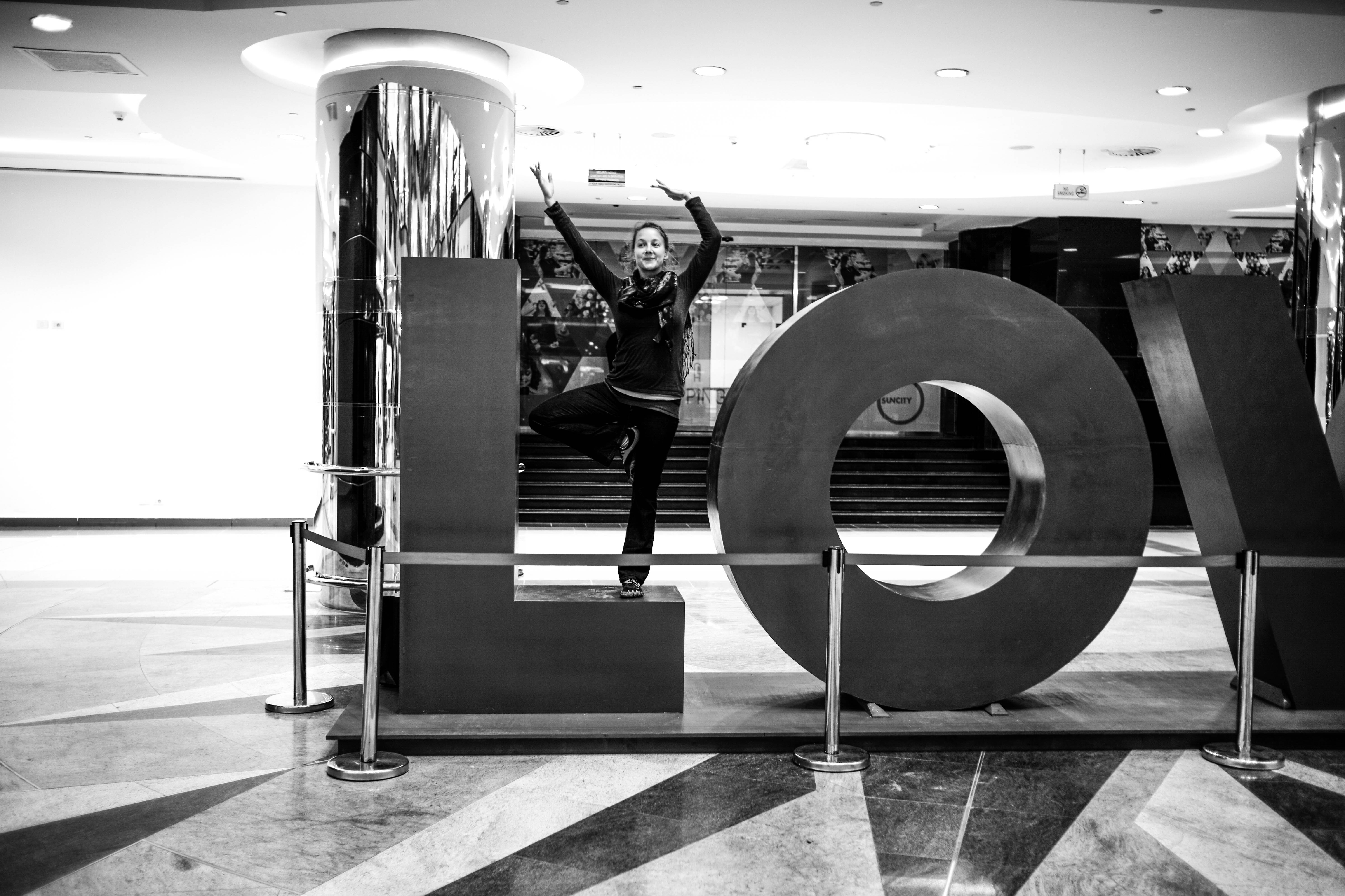 In a modern, minimalist space, a woman joyfully balances on one leg atop a bold 'LOV' sculpture, exuding a sense of playful freedom. The black and white tones enhance the contrast between her dynamic pose and the sleek, reflective surfaces around her. Soft, even lighting casts gentle shadows, emphasizing the carefree mood of the scene and inviting a sense of whimsical joy.
