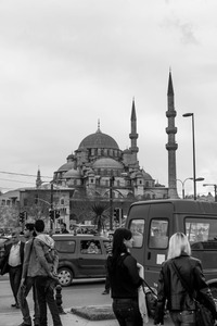 In this monochrome photograph, a bustling city scene unfolds in the foreground, where pedestrians navigate the busy streets, framed by the towering minarets of a grand mosque in the background. The cloudy sky casts a subdued light over the scene, enhancing the juxtaposition between modern life and historical architecture. The composition captures the dynamic interplay between the everyday hustle and the serene presence of the mosque, evoking a sense of timelessness and cultural richness.