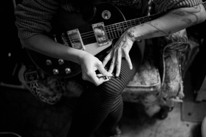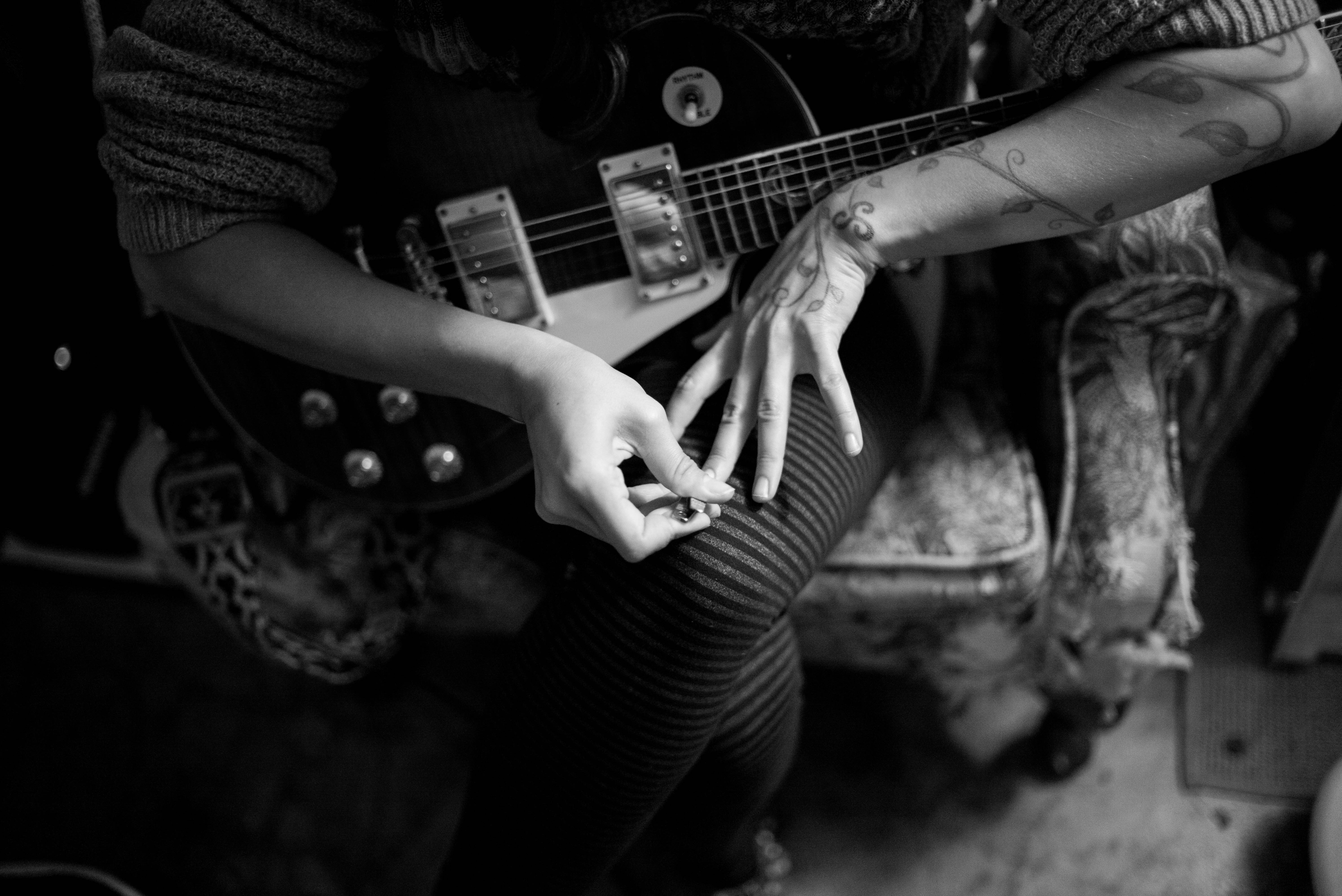 In a moody, monochrome setting, a woman intently adjusts a ring on her finger while resting beside her electric guitar. The soft lighting highlights her intricately tattooed hands and patterned tights, creating a sense of intimacy and focus. The composition, with its dreamy shadows and relaxed posture, suggests a moment of personal reflection amidst the backdrop of music.