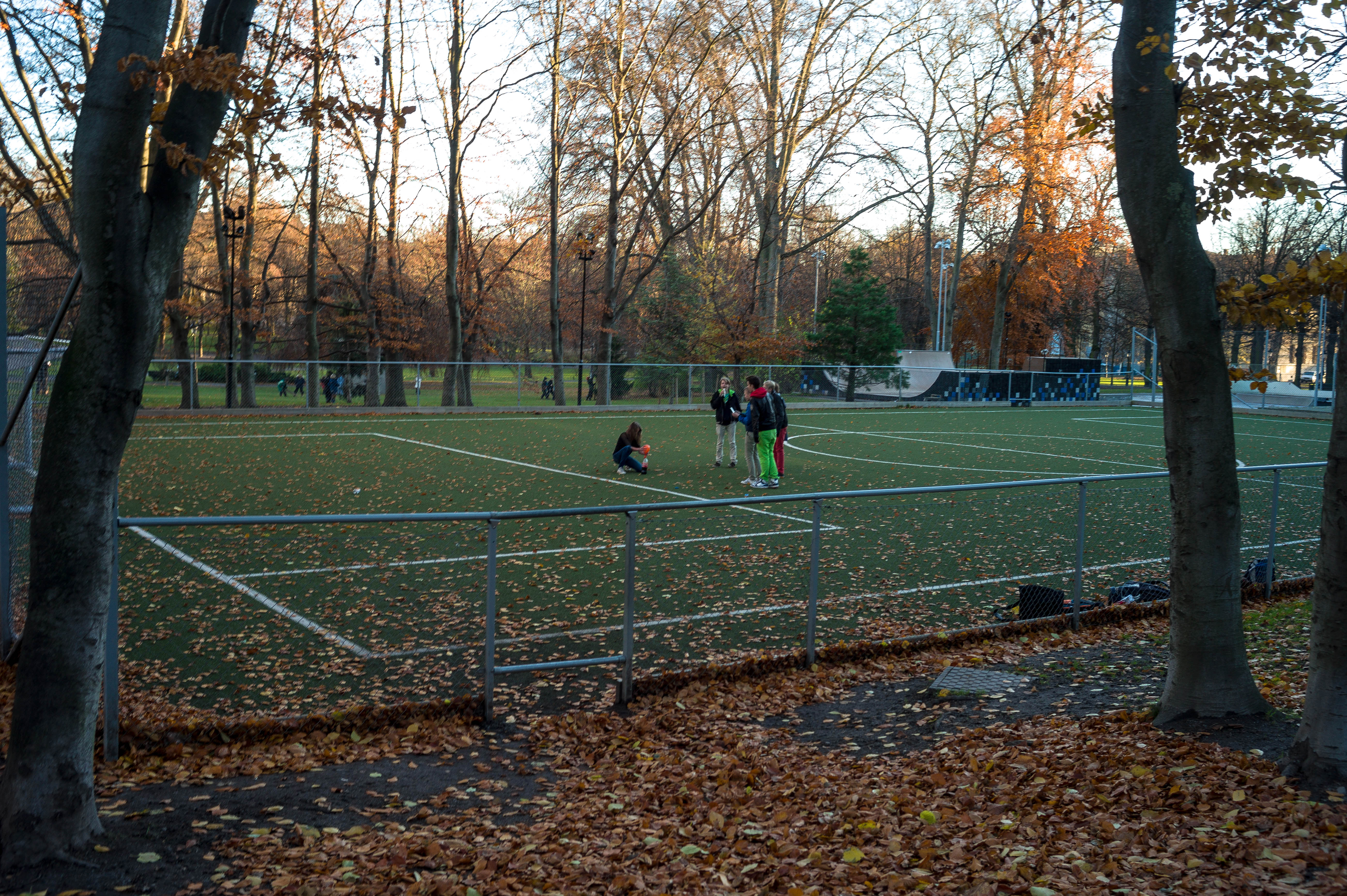 A group of friends gathers on a soccer field, surrounded by the golden hues of fallen leaves. The soft afternoon light filters through the trees, casting gentle shadows and enhancing the serene autumn atmosphere. Their relaxed postures and interactions convey a sense of camaraderie amid the tranquil park setting.
