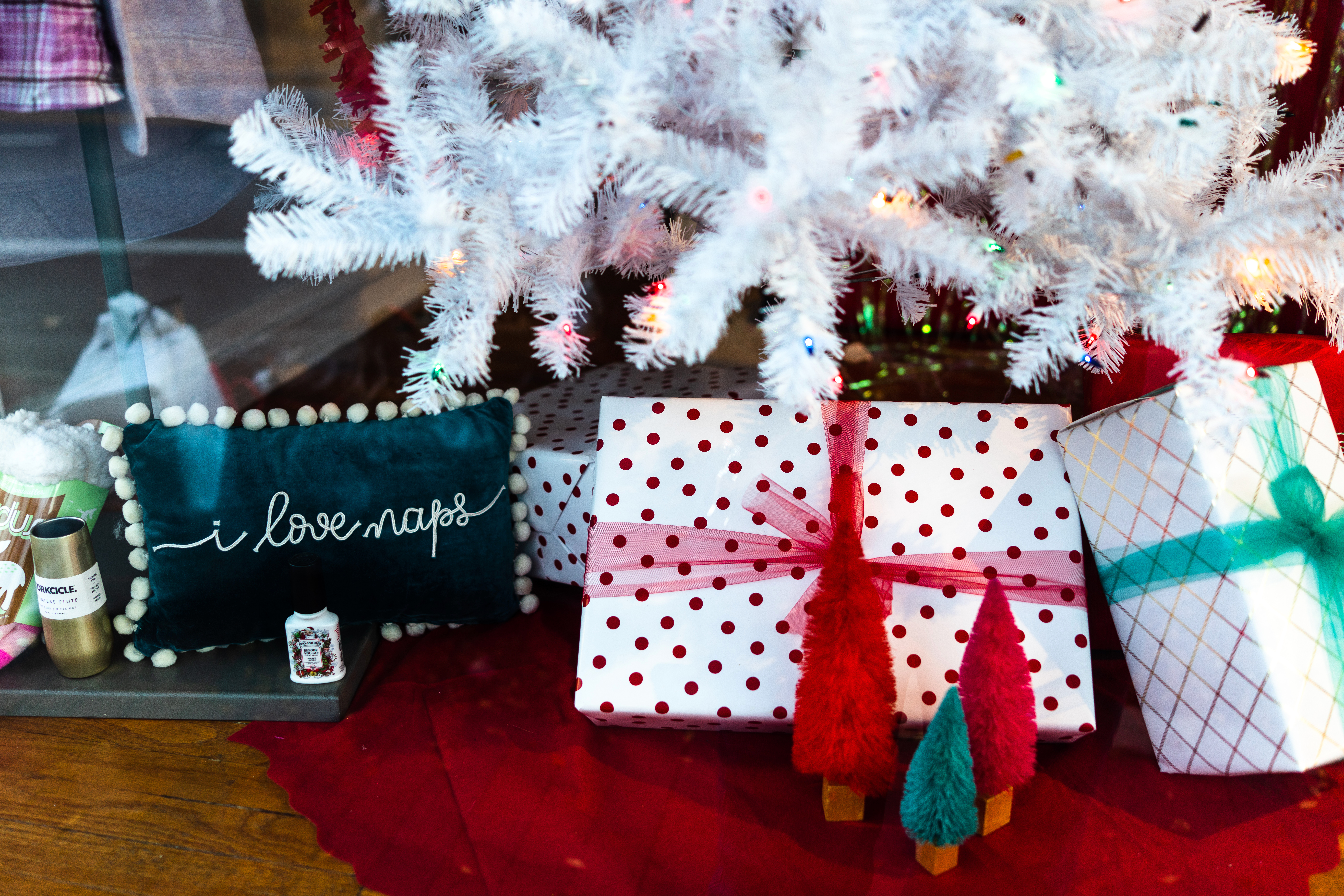 In a festive display, a white Christmas tree adorned with colorful lights stands over neatly wrapped gifts, adorned with polka dots and vibrant ribbons. The inclusion of a cozy pillow that reads 'I love naps' adds a touch of whimsy and comfort to the scene, evoking feelings of warmth and holiday cheer. Soft lighting enhances the inviting atmosphere, making this arrangement a perfect embodiment of seasonal joy.