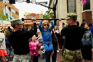 Amidst the vibrant bustle of a carnival, a child swings confidently from a pull-up bar, embodying youthful exuberance while clad in bright blue attire and sunglasses. The scene captures a lively interaction between the child and two servicemen, with a backdrop of cheerful festival colors and curious onlookers, creating a sense of camaraderie and community spirit. The soft, overcast lighting lends a cozy warmth to the moment, enhancing the playful atmosphere of the event.