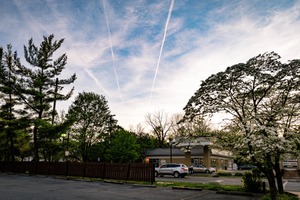 This photograph captures a tranquil early morning scene with soft, wispy clouds streaked by jet contrails above a suburban landscape. The delicate balance of natural and man-made elements, including blooming trees and the presence of a nearby shop, creates a refreshing yet calm atmosphere, illuminated by the gentle light of dawn.