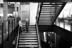 Two individuals engaged in conversation on a sleek set of stairs within a modern workspace. The monochrome palette emphasizes the structural lines and textures of the environment, adding a sense of depth and sophistication to the scene. Soft lighting filters through the space, casting gentle shadows and highlighting the relaxed yet vibrant mood of their interaction.