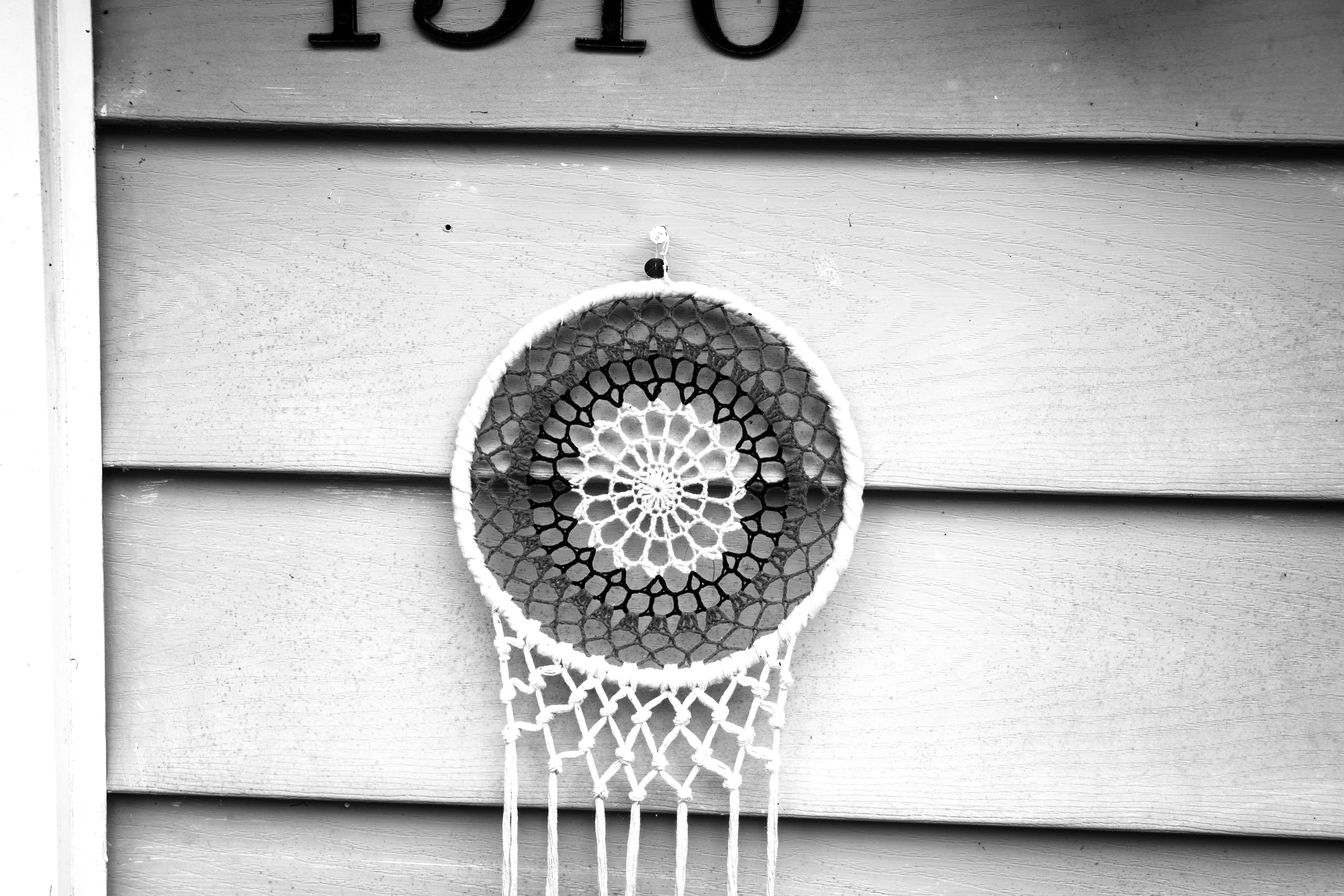 A dreamcatcher hangs against a pale wooden wall, framed by the number '1910' above it. The monochromatic palette enhances the intricate details of the dreamcatcher, casting a serene mood that invites contemplation. Soft light accentuates the textures, creating a tranquil and inviting atmosphere.