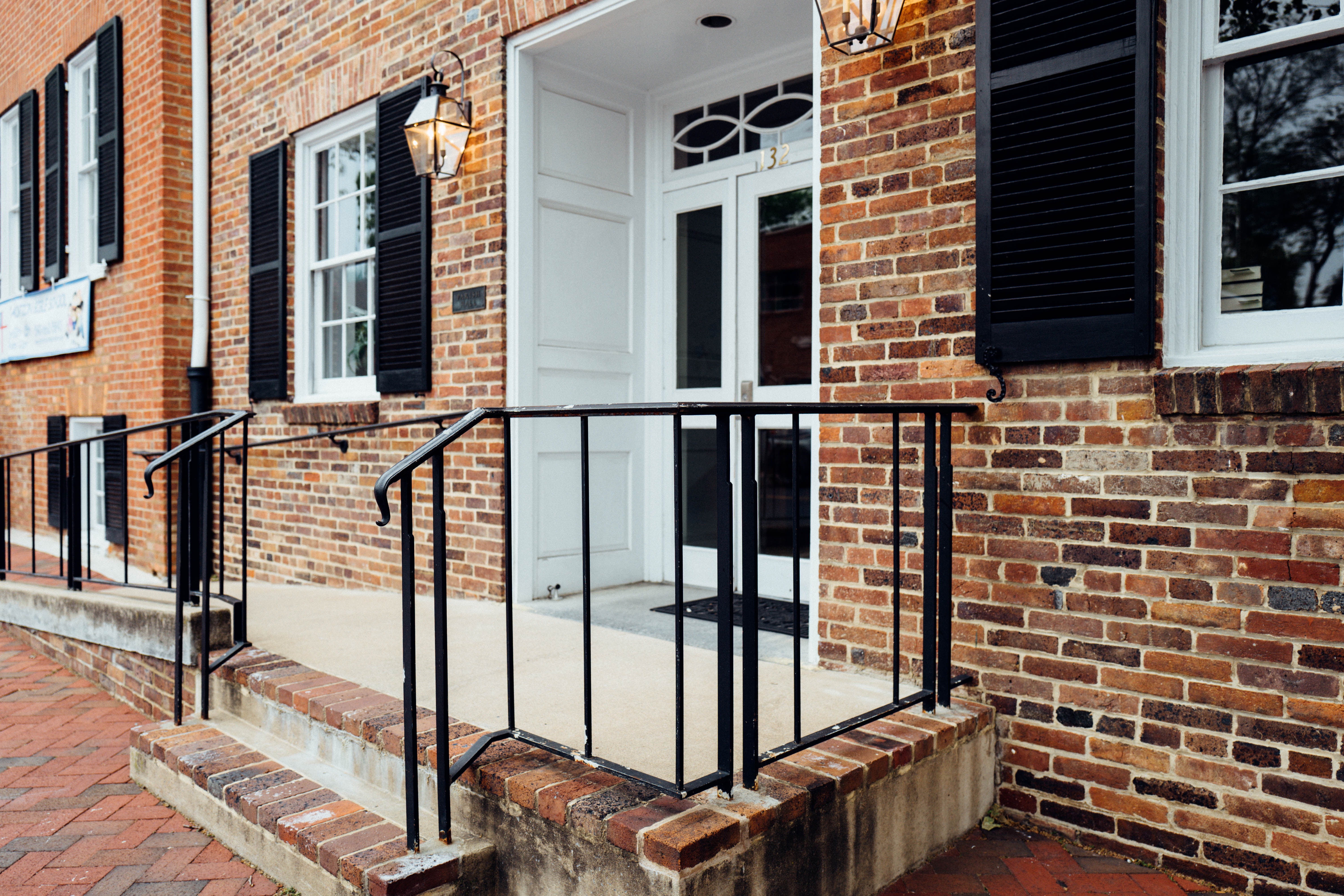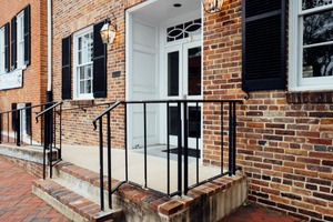 The photograph captures a charming brick entrance framed by black shutters and lanterns, inviting visitors with its warm, rustic charm. Soft, diffuse lighting enhances the textures of the bricks and highlights the simplicity of the design, evoking a sense of welcoming serenity. The composition balances vertical lines of the railing and entrance, leading the eye naturally toward the door.