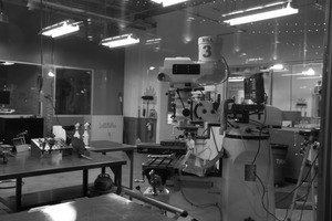 This monochromatic photograph captures a milling machine in a workshop, surrounded by tools and equipment. The stark lighting casts dramatic shadows, enhancing the clinical yet industrious atmosphere. The composition evokes a sense of stillness, as if the space is waiting for creative energy to bring it to life.