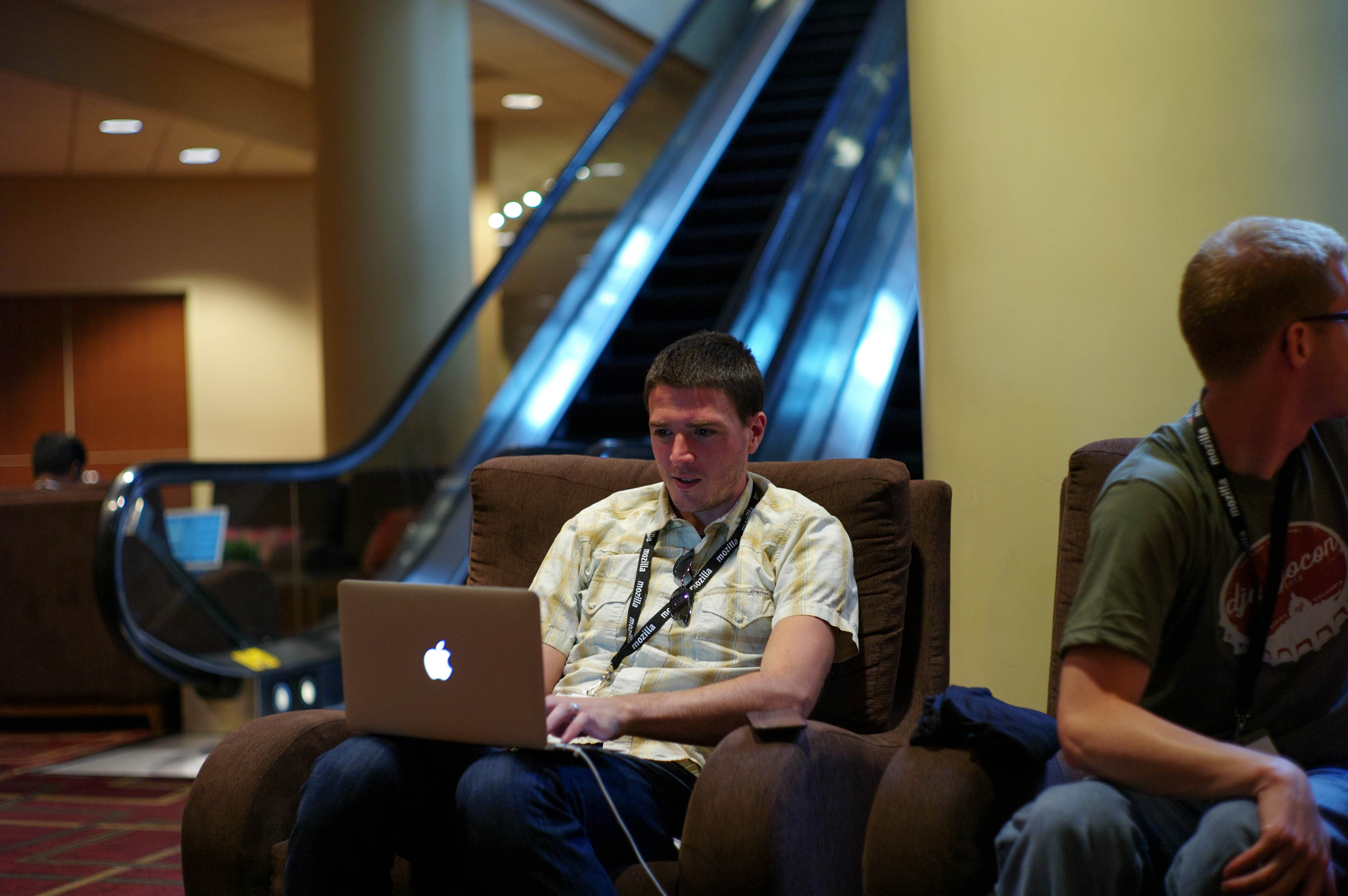 In a cozy lounge area, a young man intently works on his laptop, embodying a mood of focused concentration amidst the bustling environment. The soft lighting highlights his expression and the casual, relaxed setting, while the escalator in the background subtly hints at movement and activity beyond his immediate space. This contrast creates a contemplative atmosphere, inviting viewers to appreciate the quiet within the chaos.
