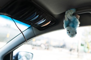 The photograph captures a whimsical blue plush toy dangling from a car's overhead visor, evoking a sense of nostalgia and playfulness. Soft, natural light filters through the car's window, creating a calm, serene atmosphere that contrasts with the busy environment outside. The composition draws the eye to the toy's vibrant color against the muted tones of the car interior, highlighting an intimate glimpse into the owner's personality.