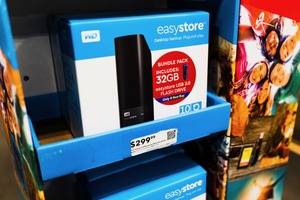 The photograph captures a neatly arranged shelf displaying a product package for an external hard drive. Bright blue and vibrant colors create a lively atmosphere, while the warm lighting enhances the appeal of the product. The price tag is clearly visible, drawing attention to the bundle offer against a backdrop of playful images, suggesting a blend of technology and joy.