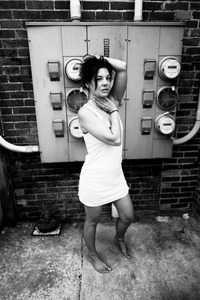 In a gritty urban setting, a woman poses gracefully against a backdrop of utility meters and exposed brick. The stark black and white contrast adds a raw depth to her expression, revealing a blend of vulnerability and strength. The play of light and shadow accentuates her features, creating a captivating interplay between the soft figure and the harsh surroundings.