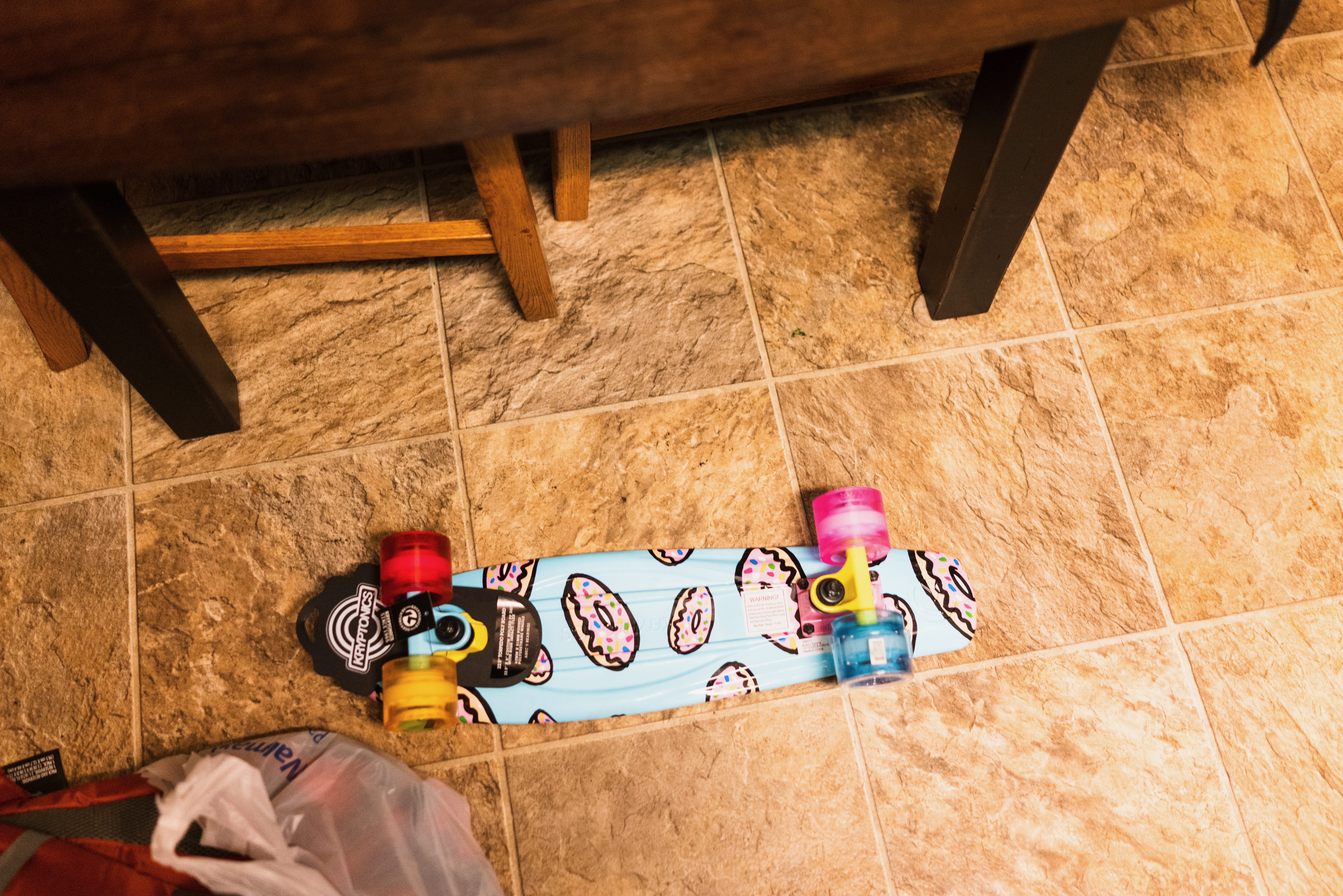 A brightly colored skateboard adorned with whimsical donut patterns rests on a textured tile floor, exuding a sense of youthful fun and adventure. The playful hues of the skateboard contrast with the muted tones of the surrounding space, creating a mood of lightheartedness. Soft, warm lighting casts gentle shadows, further enhancing the inviting atmosphere of this everyday scene.