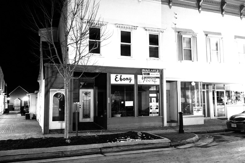 The photograph captures a quiet street scene in stark black and white, highlighting a storefront adorned with the name 'Ebony.' The muted lighting casts soft shadows, creating a somber yet inviting mood, while the empty sidewalk and bare tree branches evoke a sense of stillness and solitude.