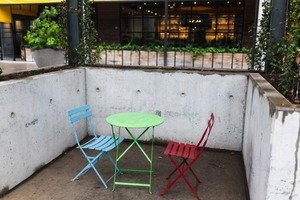 A cozy corner is adorned with a vibrant green table and mismatched chairs in soft blue and red, creating an inviting yet intimate seating arrangement. The modern concrete structure contrasts with the cheerful colors, while gentle lighting from the background enhances the warmth of the scene. Lush greenery peeks through, adding a touch of nature to this urban oasis.