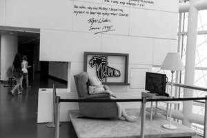 This striking black-and-white photograph captures a solitary, plush figure resting in an oversized chair, symbolizing themes of comfort and isolation. Bright neon signage contrasts with the muted tones, adding a surreal quality to the scene, while a subtle glow from the lamp enhances the mood of introspection. The openness of the space contrasts with the enclosed setup, inviting viewers to ponder the dichotomy of solitude amidst public life.