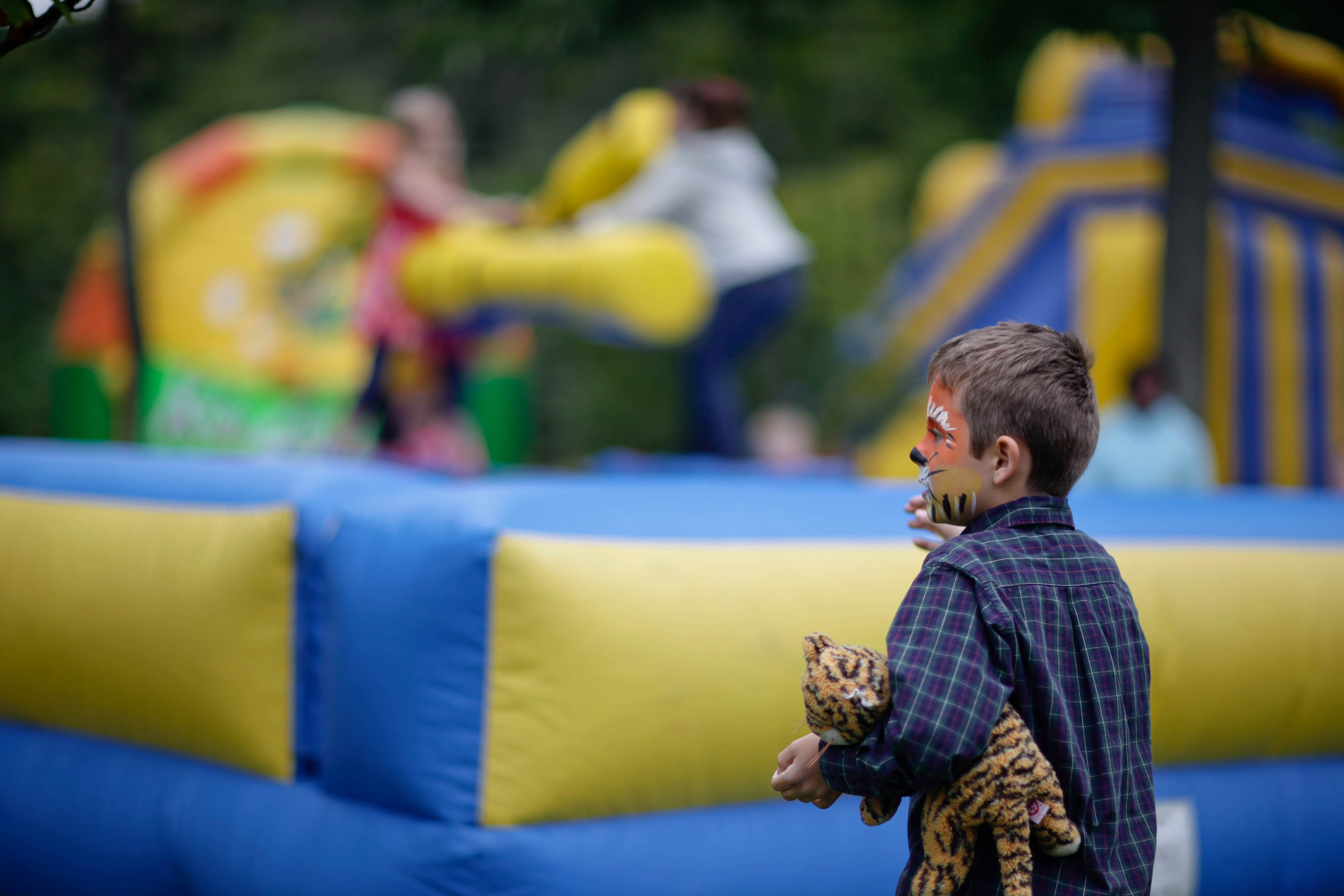 A young boy stands on the edge of a vibrant play zone, clutching a stuffed toy, his face painted like a tiger. The lively backdrop features inflatables and playful figures, yet he seems lost in thought, creating a contrast between the joyous chaos around him and his quiet demeanor. Soft lighting enhances the scene, casting a gentle glow that evokes a sense of nostalgia and innocence.