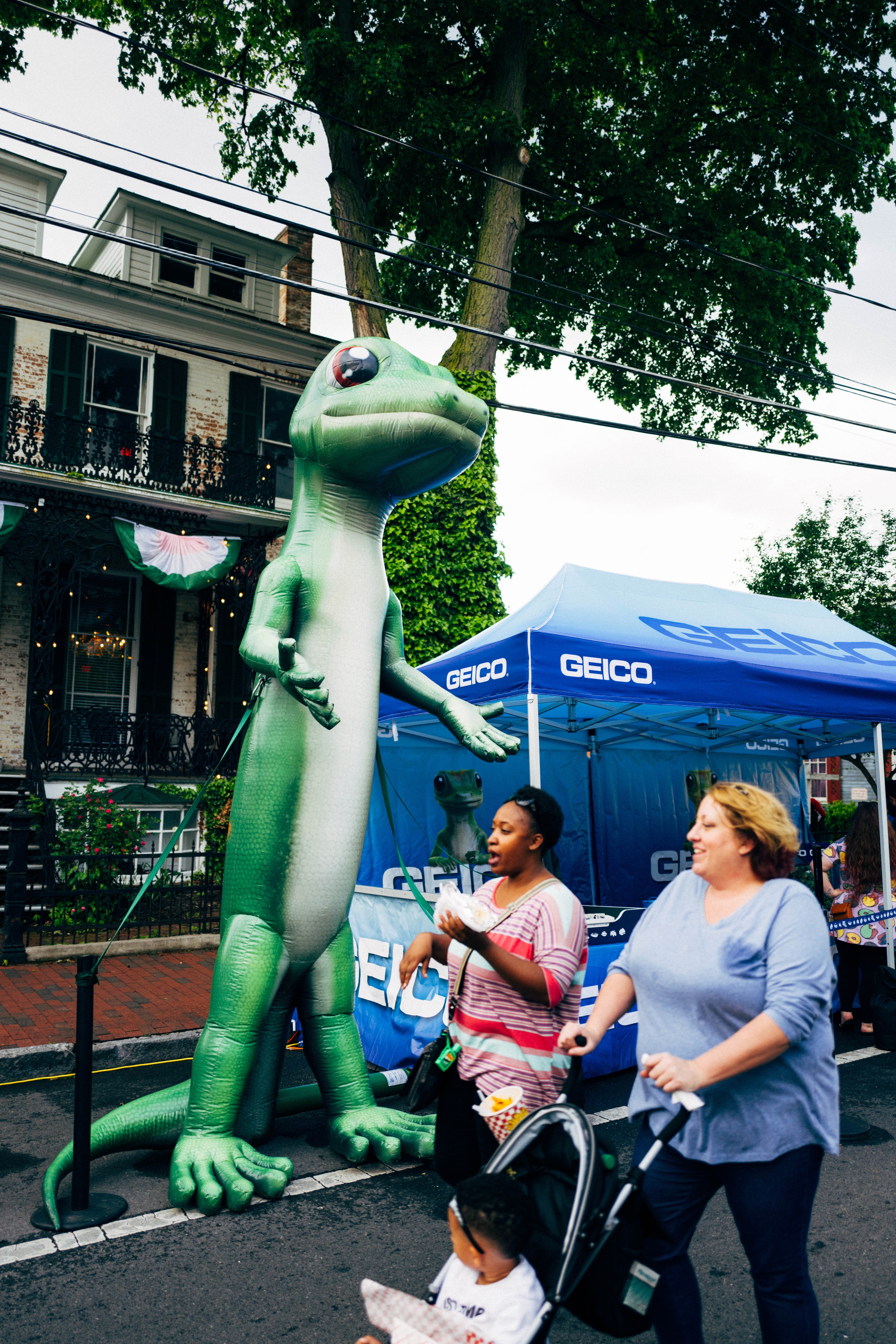 In a lively street scene, a giant inflatable gecko stands cheerfully beside two women walking past, emphasizing the playful atmosphere of the festival. The setting features vibrant colors from the decorations and tents, while the cloudy sky adds a moody contrast to the otherwise festive backdrop. The women’s expressions of delight hint at a carefree celebration, inviting viewers into the joyful moment.
