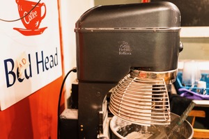 The photograph captures a vintage-style mixer, prominently displayed with a warm ambiance. Soft, diffused lighting casts a cozy glow over the scene, evoking a sense of nostalgia in this inviting coffee shop setting. The vibrant red backdrop and playful signage enhance the cheerful mood, inviting patrons to indulge in the delightful world of beverages and baked goods.