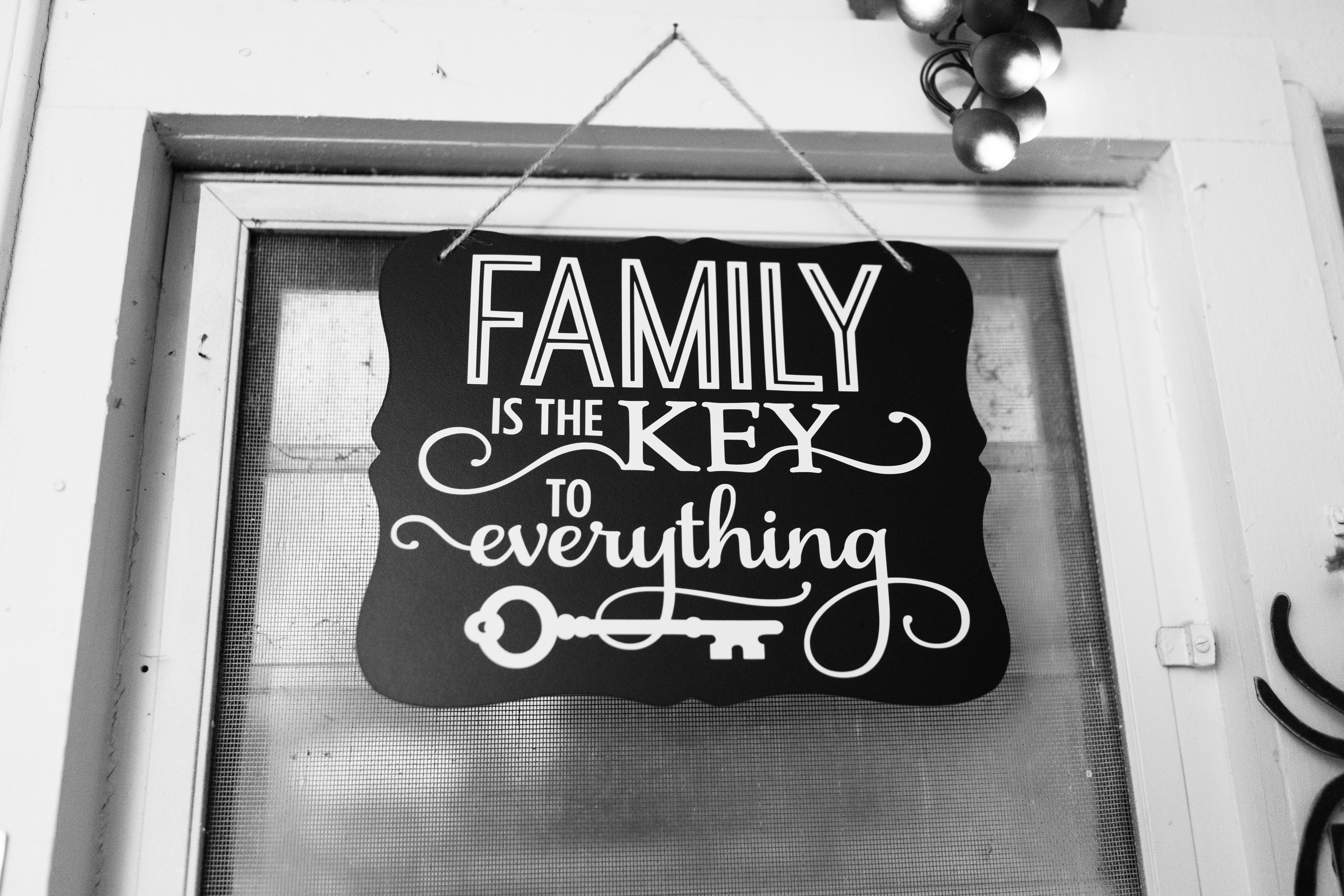 This photograph features a striking black and white sign that reads, 'Family is the key to everything,' hanging prominently in a doorway. The bold typography and smooth lines evoke a sense of warmth and togetherness, enhancing the inviting atmosphere of the home. The soft lighting and neutral background suggest a cozy space where family values are cherished and celebrated.