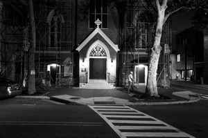 This photograph captures an old church shrouded in night, partially concealed by scaffolding, suggesting both decay and the promise of renewal. The stark black and white contrast enhances the somber mood, while the illuminated entrance invites reflection amidst the shadows. Two figures walking by add a sense of life and movement, grounding the scene in the quiet rhythm of urban existence.