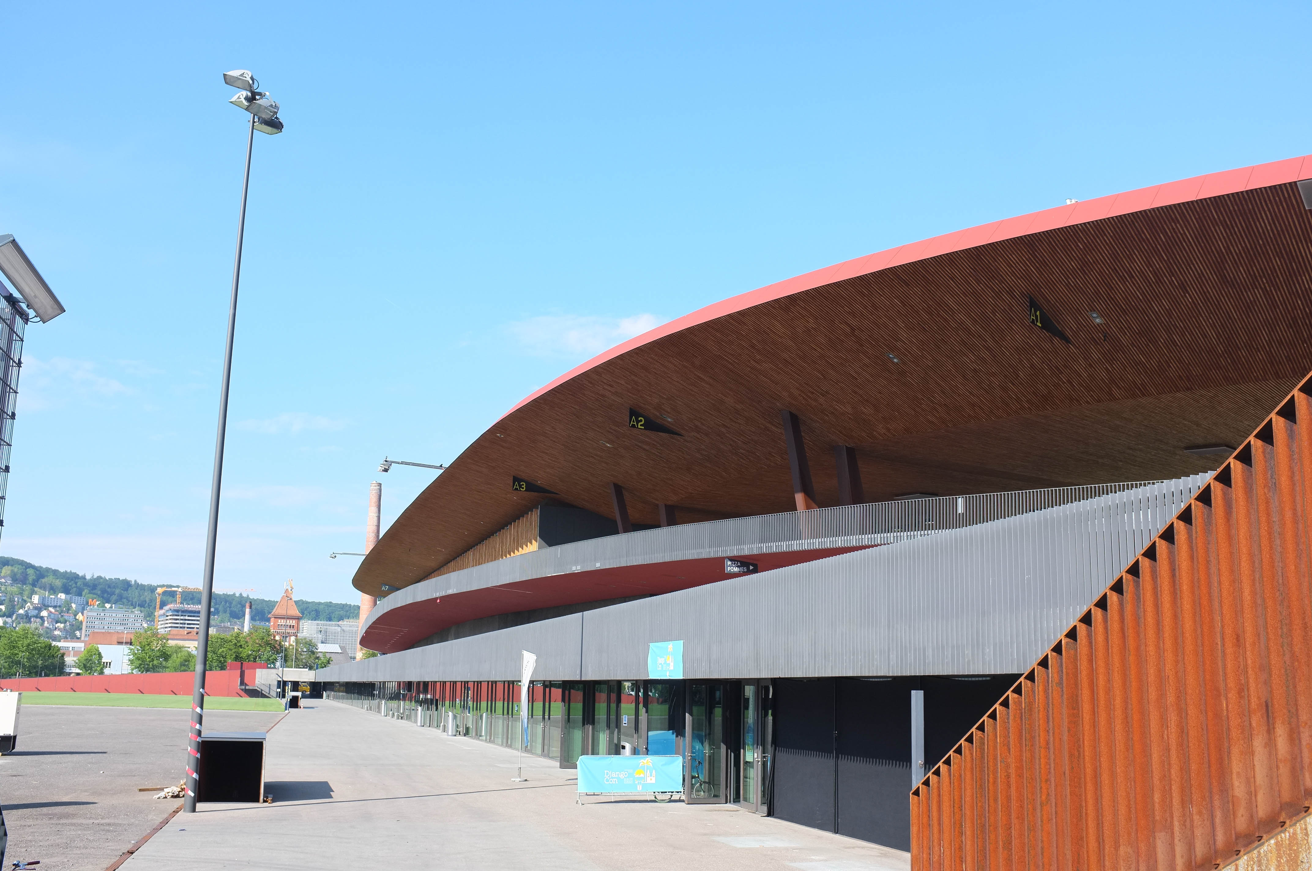 This photograph showcases a striking modern building with a sweeping, angular roof that creates a sense of movement and fluidity. Bright sunlight accentuates the contrasting textures of the materials, enhancing the warmth of the wood and the sleekness of the metal. The composition draws the eye along the lines of the structure, evoking a feeling of openness and contemporary elegance against a clear blue sky.