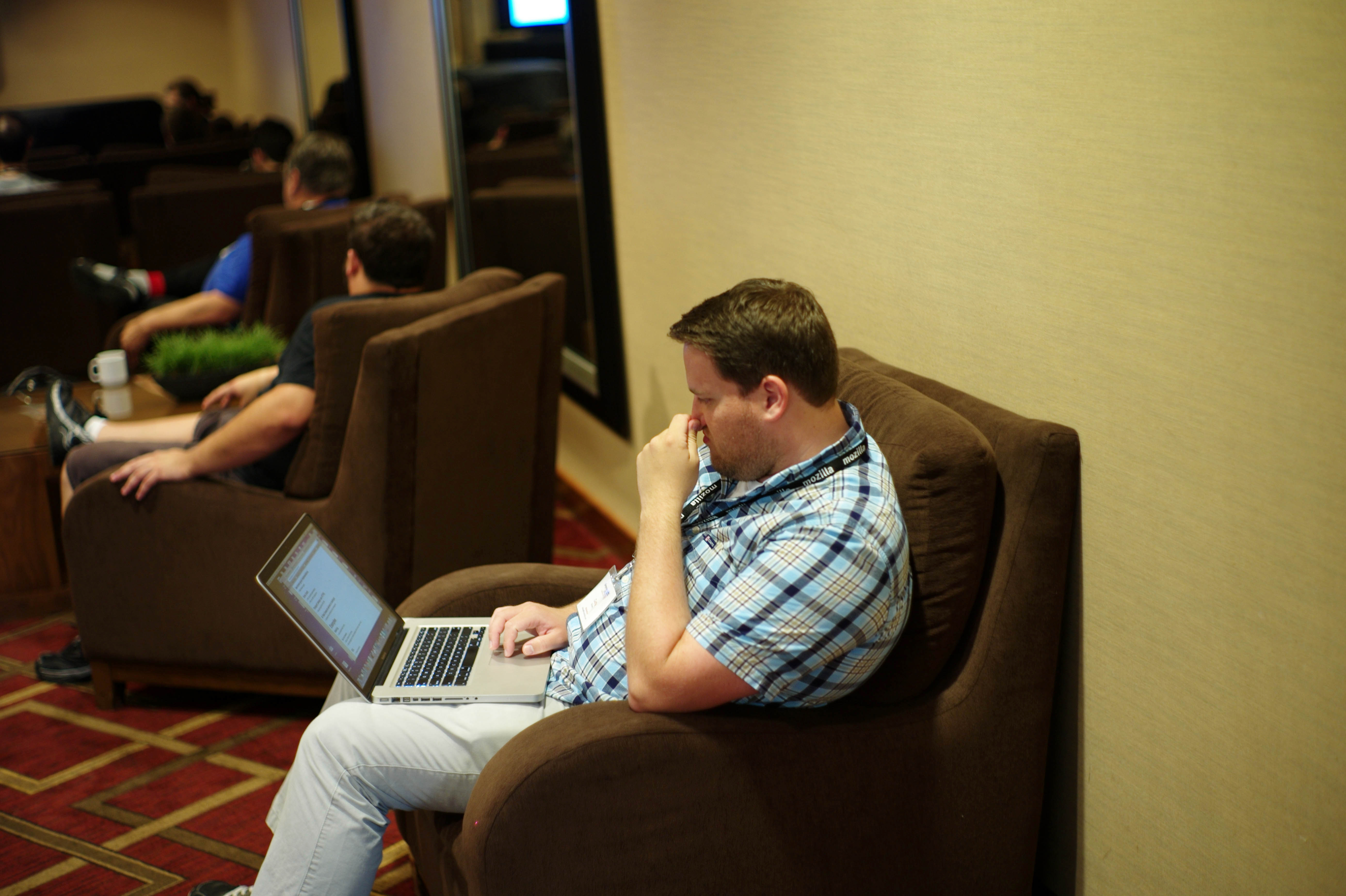 A man sits absorbed in his work on a laptop, his expression contemplative as he rests his chin on his hand. The warm lighting and soft textures of the brown chairs create a cozy yet serious atmosphere, contrasting with the bustling background of other attendees. The composition draws the eye to his focused demeanor, encapsulating a moment of quiet concentration amidst the noise of a busy environment.