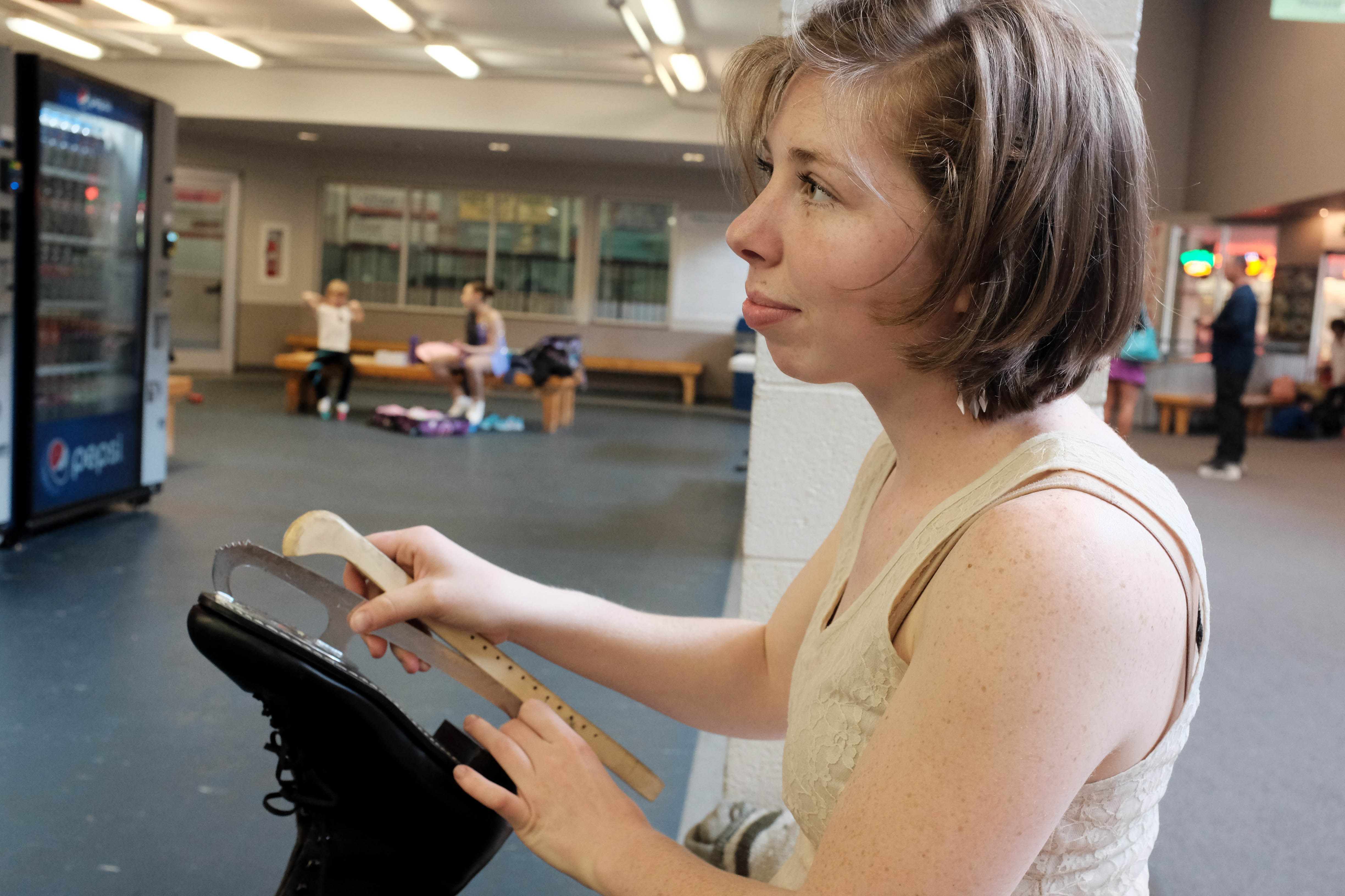 In a softly lit indoor space, a young woman sits thoughtfully, holding a ruler while focused on her black boot. The casual atmosphere is enhanced by fellow skaters in the background, evoking a sense of community and purpose amidst a moment of quiet contemplation.
