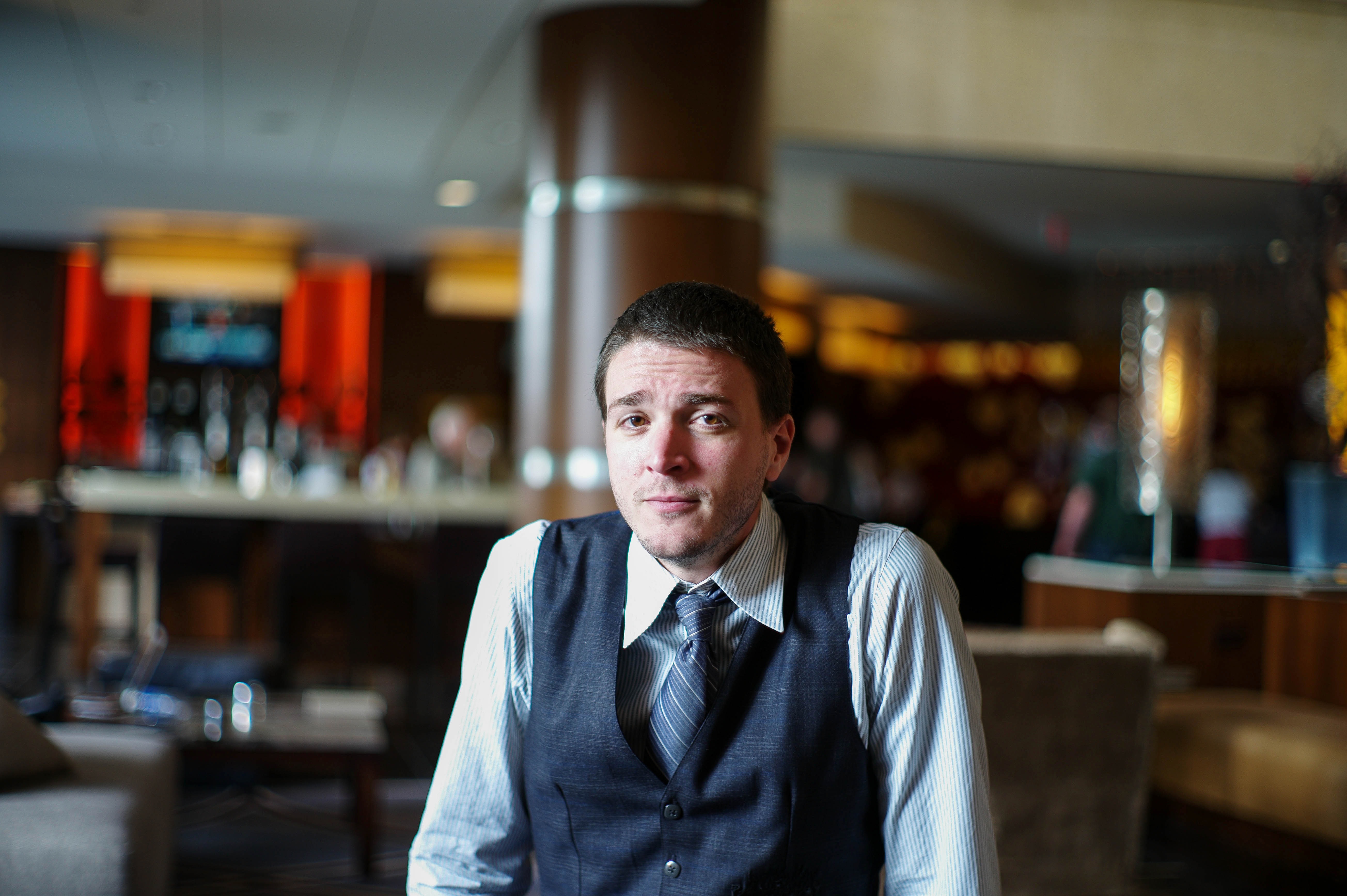 In a sophisticated setting, a man dressed in a sharp vest and dress shirt gazes contemplatively, exuding a blend of confidence and introspection. The warm, ambient lighting highlights the subject against a blurred bar background, creating an intimate yet upscale atmosphere. The composition draws the viewer's eye to his expression, inviting a sense of curiosity about his thoughts.