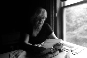 In a dimly lit room, an elderly woman sits by a window, absorbed in a letter she holds delicately. The soft interplay of light and shadow enhances the mood of contemplation, evoking a sense of nostalgia and depth. Surrounding her, scattered papers hint at a story waiting to be uncovered, while the rain-specked glass adds a touch of wistfulness to the scene.