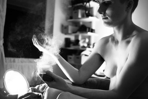 Captured in soft monochrome, a figure sits gracefully, casting a serene mood as they delicately apply a mist from a jar. The lighting is gentle yet dramatic, highlighting the contours of the subject and creating a sense of intimacy amidst a softly blurred background. Vapor swirls in the air, enhancing the ethereal atmosphere and inviting contemplation.