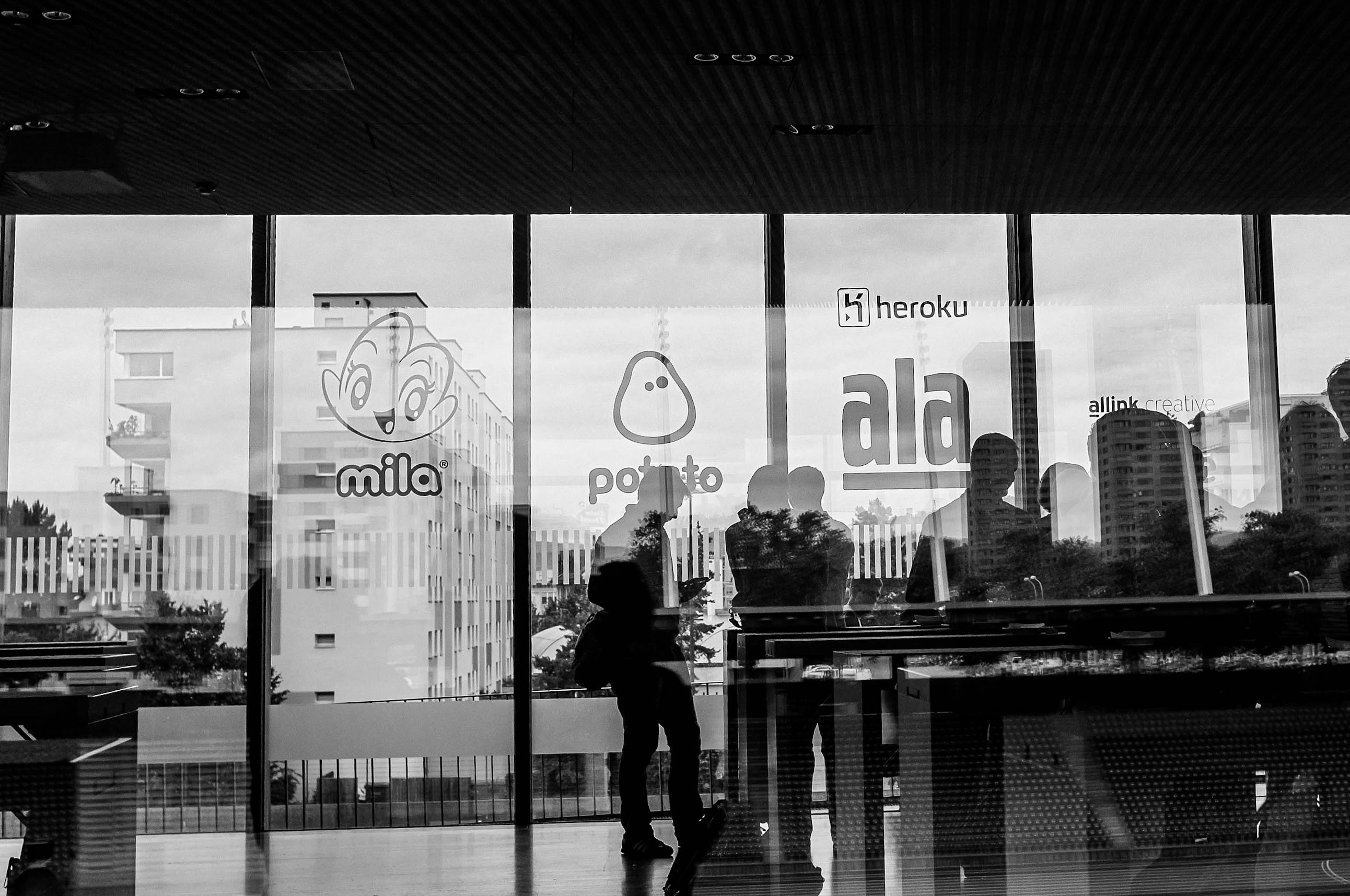 This striking black and white photograph captures the silhouette of a lone figure standing before a glass wall adorned with colorful logos. The interplay of reflections and shadows creates a contemplative mood, hinting at the convergence of modern commercialism and individual thought amidst an urban backdrop. Soft, diffused daylight enhances the ambiance, highlighting the blend of design and people in a contemporary setting.