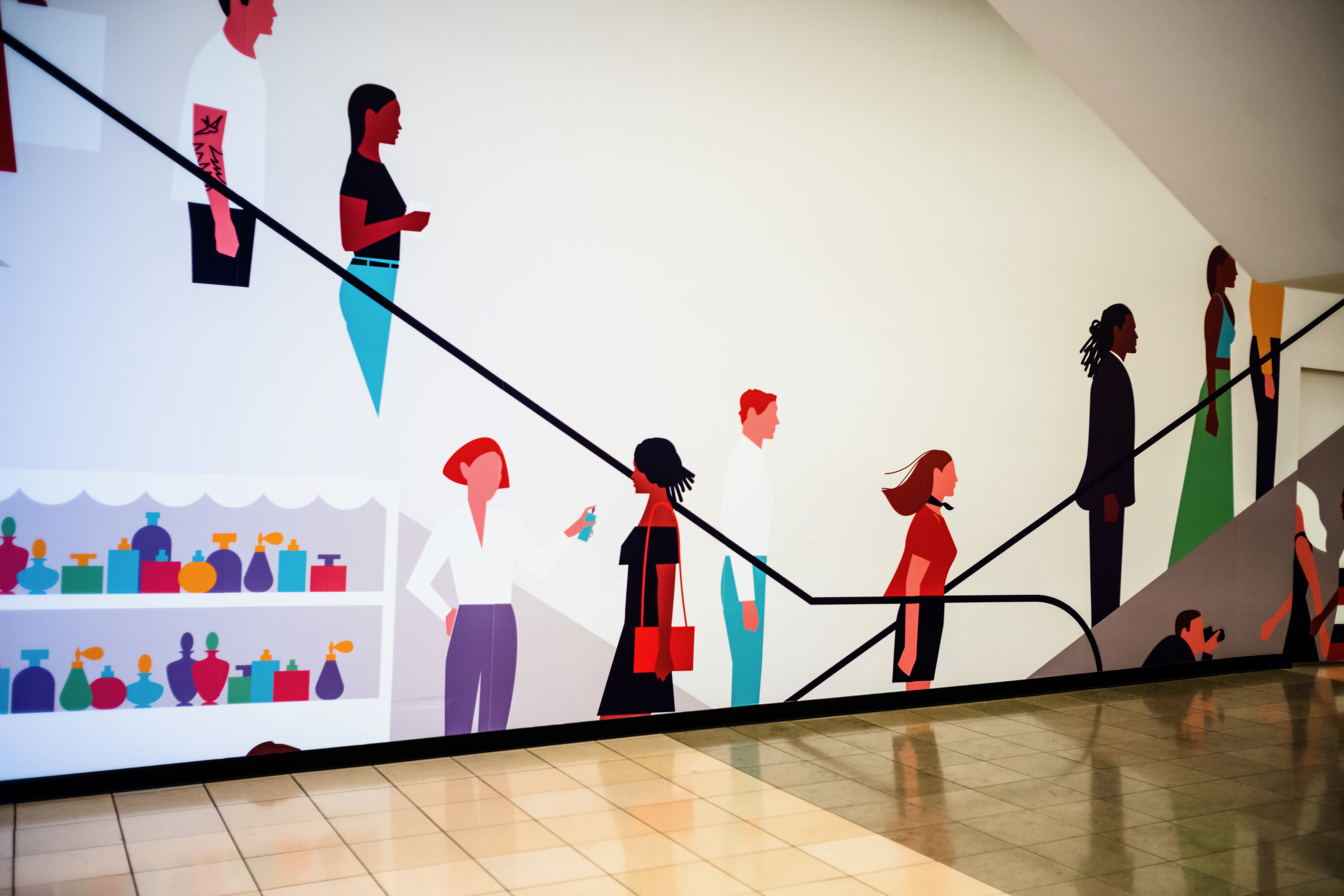 This vibrant mural captures a dynamic scene of urban life, featuring a diverse cast of figures ascending a staircase. The playful composition and bold colors evoke a sense of movement and modernity, while the soft lighting adds a welcoming warmth to the space. Each character is rendered in a minimalist style, creating a contemporary feel that reflects the energy of city living.